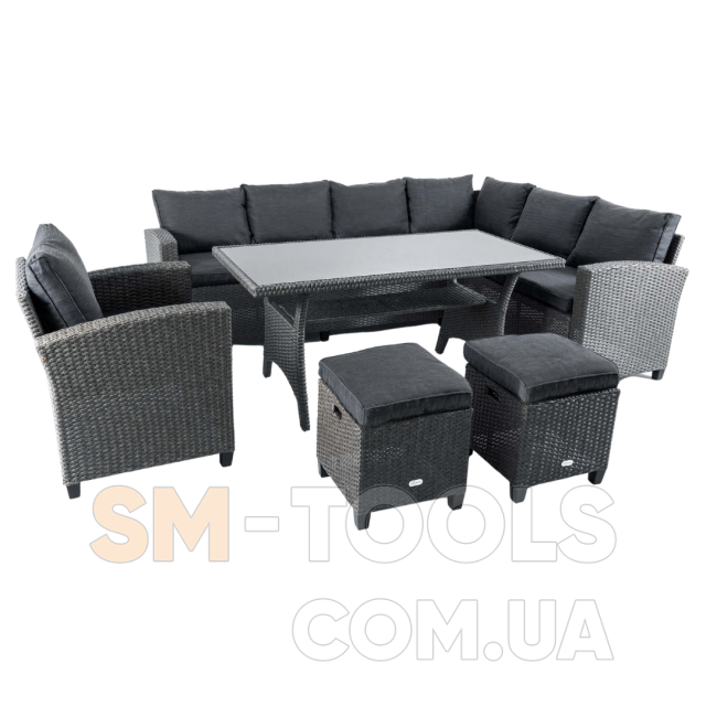 Бажаєте провести час з друзями чи родиною на природі? Набір меблів Rossano від DiVolio - буде чудовим вибором! Він ідеально підходить не лише для саду, а й легко розміститься на великому балконі чи терасі. Набір складається з 6-місного кутового дивану, крісла, великого столу та 2-х пуфів. Великий диван можна розкласти на два окремих 3-місних. Завдяки використанню якісного техноротангу, плетені меблі Rossano забезпечать вам естетичну насолоду, комфорт та зручність! Диван, крісло та пуфи оснащені м'якими зручними подушками. Теплий колір техноротангу надає інтер'єру додаткового затишку.