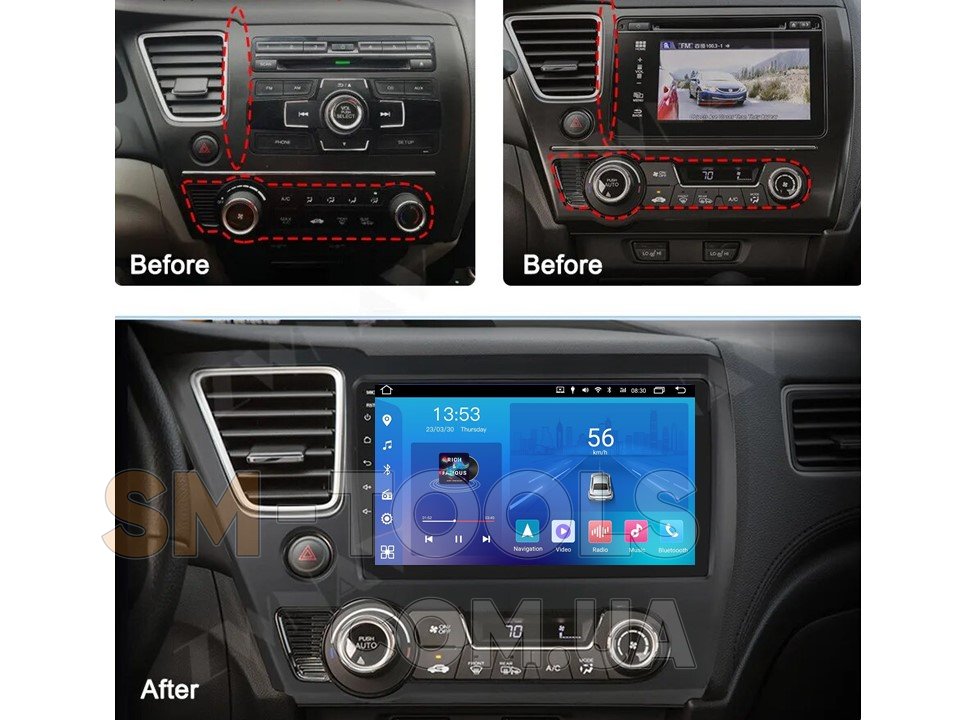 3+32Gb, 9", Android 12, 8 core, Wi-Fi, 4G LTE, CarPlay, Android auto, DSP, 1280*720 Штатна магнітола FORS.auto є повноцінною інформаційно-розважальною системою. Вона виготовлена із високоякісних матеріалів, а її форма ідеально підходить під панель машини.Легке з'єднання з машиною по CAN-шиніМагнітола FORS.auto має можливість підключення до бортового комп'ютера, якщо комплектація, рік випуску та модель авто підтримує його роботу. Система підключається за допомогою can-шини, а бортовий комп'ютер дозволить керувати пристроєм. Прилад має безліч функцій: зручна панель керування, датчик відчинених дверей, терморегуляція та інші. Магнітола зручна у використанні, оскільки штатні кнопки на кермі дозволяють з легкістю користуватися пристроєм під час поїздки.GPS навігація надає можливість вибрати необхідну платформу та карту Навігаційні програми працюють як із підключенням інтернету, так і офлайн. Вони дають можливість зорієнтуватися у незнайомій місцевості, знайти оптимальний маршрут та відображають наявність пробок. Встановити програму можна з Play Market. Обладнання має швидку швидкість з'єднання, деталізує об'єкти в 3D картах, дає можливість орієнтуватися по компасу, інформує про знаходження над рівнем моря, правильно будує маршрут. GPS антена, яка входить у комплект, дає можливість визначити місцезнаходження точно та без затримок.Функція Bluetooth з мікрофоном та можливістю передачі інформації про трек З дисплея можна синхронізувати телефонні дані та керувати телефонною книгою, а функція Hands Free дозволяє продовжувати рух без зупинок і розмовляти в дорозі.Штатна магнітола FORS.auto відображає інформацію про треки на дисплеї, а також надає можливість слухати музику та перемикати плейлист смартфона.Підтримка Wi-Fi и 3G/4G модемівМагнітола підтримує 3G и 4G модеми, а також має WiFi. Можна встановлювати програми, працювати з навігацією, переглядати YouTube та інші мультимедіа, спілкуватися в соціальних мережах і різних месенджерах. Бездротове WiFi з'єднання мультимедійної системи, і підключення зовнішніх usb-модемів дозволяє завжди бути на зв'язку з близькими, переглядати улюблені фільми, бути в курсі свіжих новин і розмовляти по відеозв'язку. Не потрібно встановлювати спеціальні програми або змінювати налаштування для підключення до Інтернету. Все, що потрібно, це вставити модем в usb вхід, і підключення відбудеться автоматично. Автомагнітолу можна підключити до мережі за допомогою смартфона або портативного модему WiFi.Камери переднього та заднього виду За допомогою функції підключення камер переднього та заднього виду, паркування більше не завдаватиме незручностей. Також вони забезпечують добрий огляд.Підтримка сервісу Google Play MarketШтатна магнітола має підтримку Google Play Market. Цей сервіс надає широкий перелік програм, які щоденно оновлюються. Ви зможете встановити необхідні програми, і користуватися ними так само, як і на смартфоні.Характеристики Штатна магнітола FORS.auto М300 для Honda Civic (3+32Gb, 9") 2013-2016