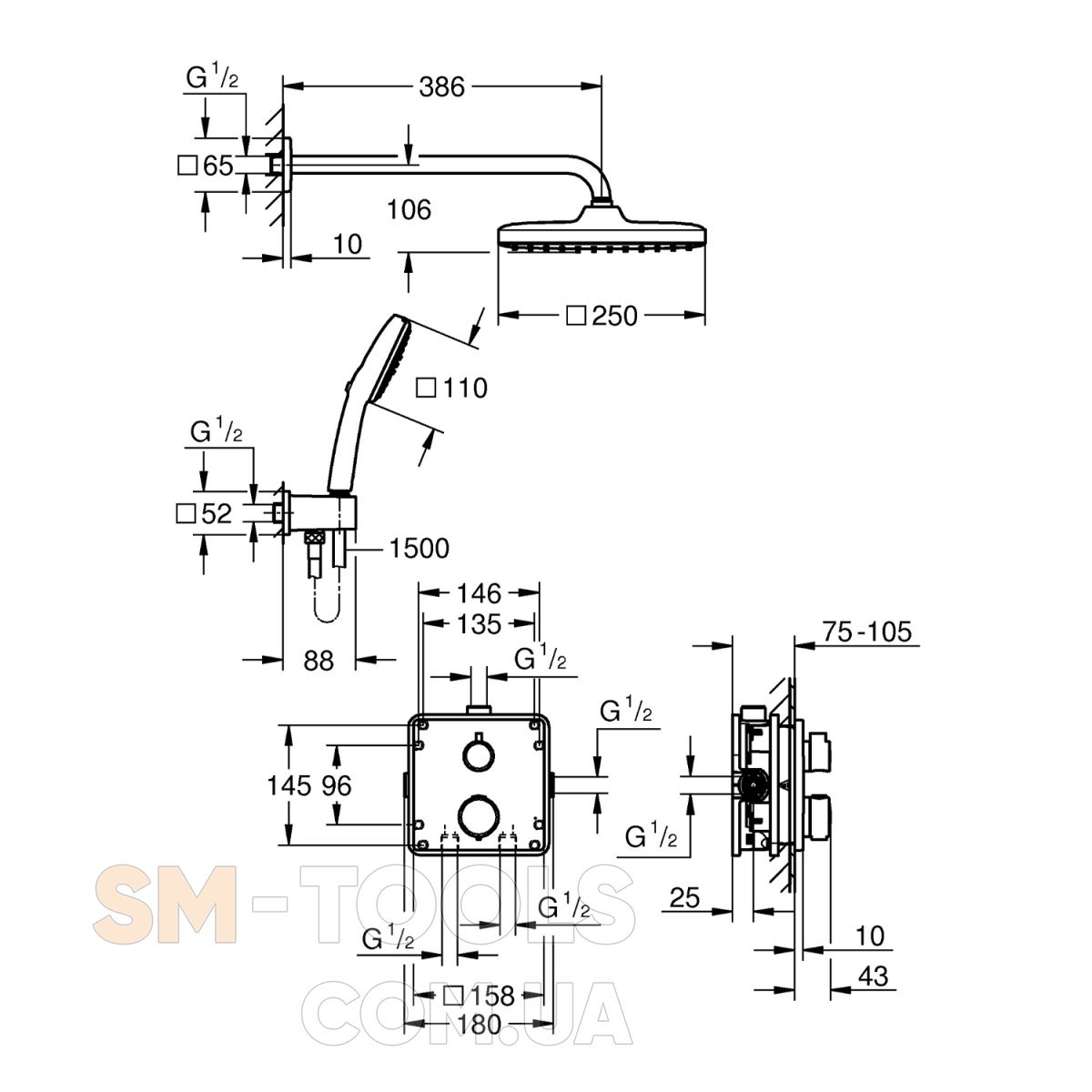 Душова система прихованого монтажу термостатична Grohe QuickFix Precision Grohtherm Cube 34882000 - це ідеальний комплект для вашої ванної кімнати, який об'єднує стиль, зручність та високу ефективність. Цей комплект включає в себе термостат Precision та універсальну вбудовану частину Rapido SmartBox для прихованого монтажу, які поєднують сучасний дизайн та надзвичайну функціональність, завдяки німецькій майстерності. Технологія GROHE TurboStat гарантує постійну температуру води з моменту включення, а технологія GROHE Water Saving зменшує споживання води та енергії без шкоди для продуктивності. Кнопка GROHE SafeStop налаштована на температуру 38°C для запобігання опікам, і система GROHE SafeStop Plus дозволяє встановити межу в 43°C для додаткової безпеки. Верхній душ діаметром 250х250 мм та кронштейн довжиною 380 мм мають розслаблюючий режим GROHE PureRain. Ручний душ 110х110 мм зі шлангом TwistStop довжиною 1500 мм пропонує два режими: Jet сфокусований для потужного миття, а Rain такий же ніжний, як літній дощ. Технологія GROHE DreamSpray забезпечує рівномірний потік води з кожної форсунки, які легко очищаються за допомогою системи SpeedClean. Довговічне покриття GROHE Long-Life забезпечить бездоганний вигляд на тривалий час. Монтаж системи настінної накладки швидкий і простий завдяки системі GROHE FastFixation, яка включає систему фіксації, настінні розетки, ущільнювачі та кріплення, гарантуючи відсутність ризику протікання. Душова система прихованого монтажу Grohe QuickFix Precision Grohtherm Cube - це стильно, інтелектуально та гарантовано приносить задоволення від прийняття душу!Характеристики Душова система прихованого монтажу термостатична Grohe QuickFix Precision Grohtherm Cube 34882000