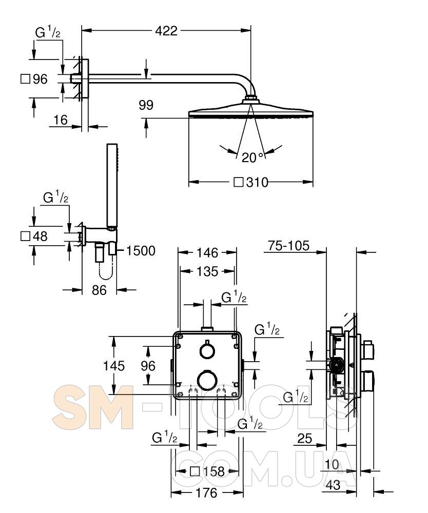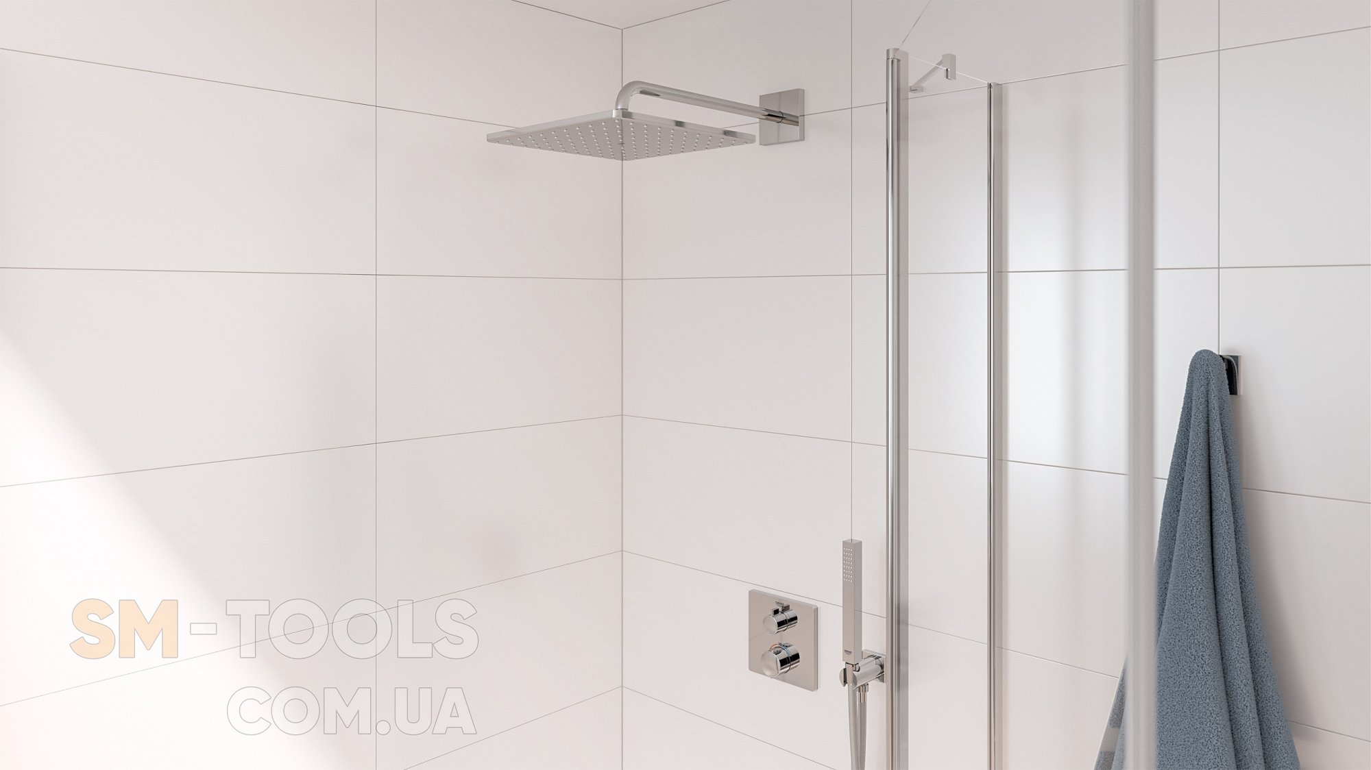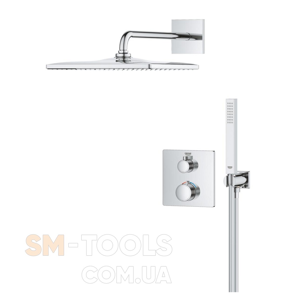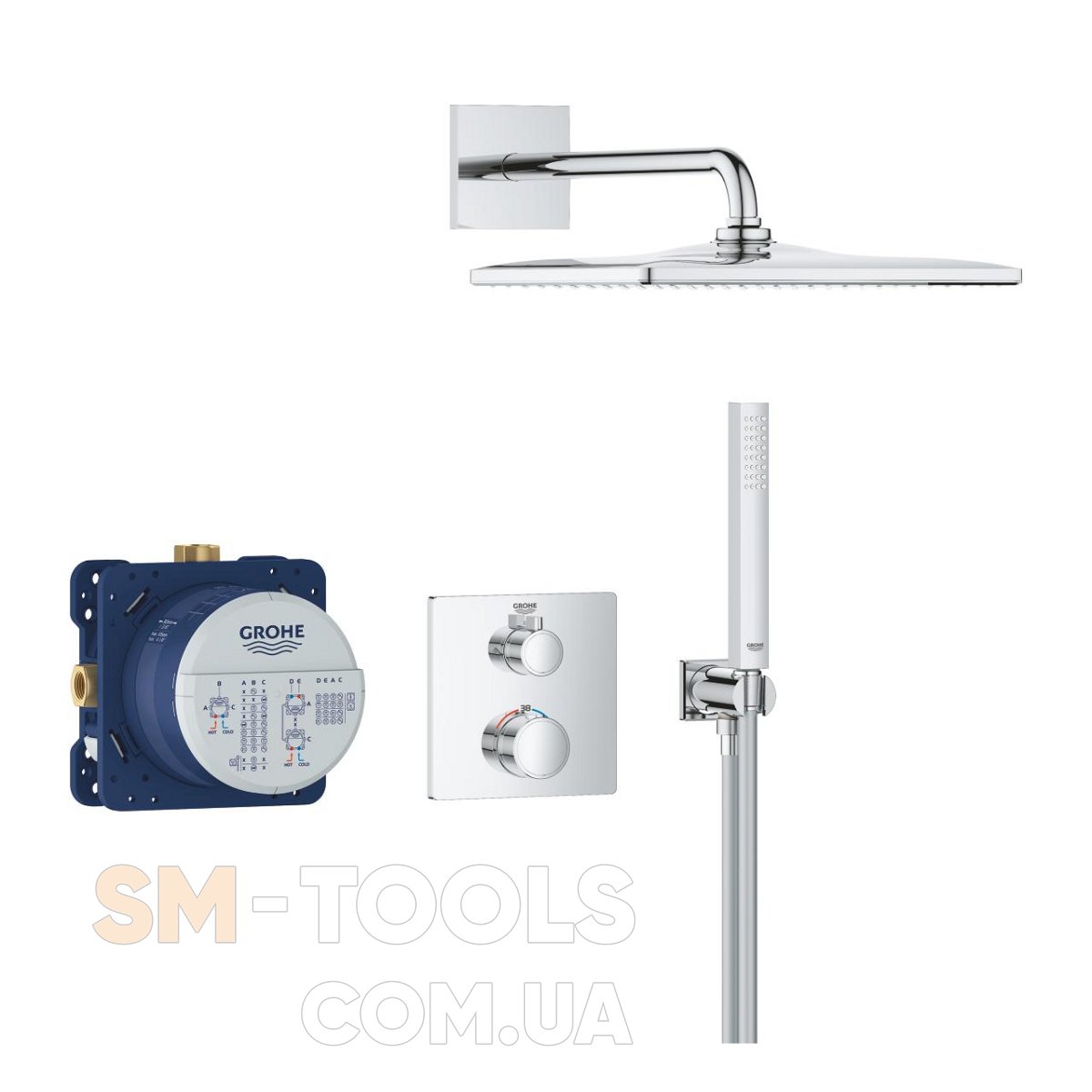 складається із: Термостатичний змішувач для душу прихованого монтажу на 2 виходи з інтегрованим запірним/перекидним клапаном (24 079) GROHE Rapido SmartBox Універсальна вбудована частина, 1/2 (35 604) Верхній душовий набір Rainshower Mono 310 Cube (26 563) включно з горизонтальним кронштейном 422 мм (26 145) настінне з'єднання 1/2" з тримачем (26 659) ручний душ Euphoria Cube Stick, 1 режим струменю (27 698) душовий шланг Silverflex 1500 мм 1/2" x 1/2" (28 364) додатковий регулятор витрати 9,5 л/хв для ручного та верхнього душуБренд : GroheКолекція : GrohthermДовжина душового шланга : 1500 ммКількість режимів струменя ручного душа : ОдинМонтаж : Прихований монтажНаявність виливу для ванни : Без виливуТип душової системи : З термостатичним змішувачемДовжина упаковки : 500 ммШирина упаковки : 380 ммВисота упаковки : 295 ммВага упаковки : 8.7 кгКраїна виробник : Німеччина