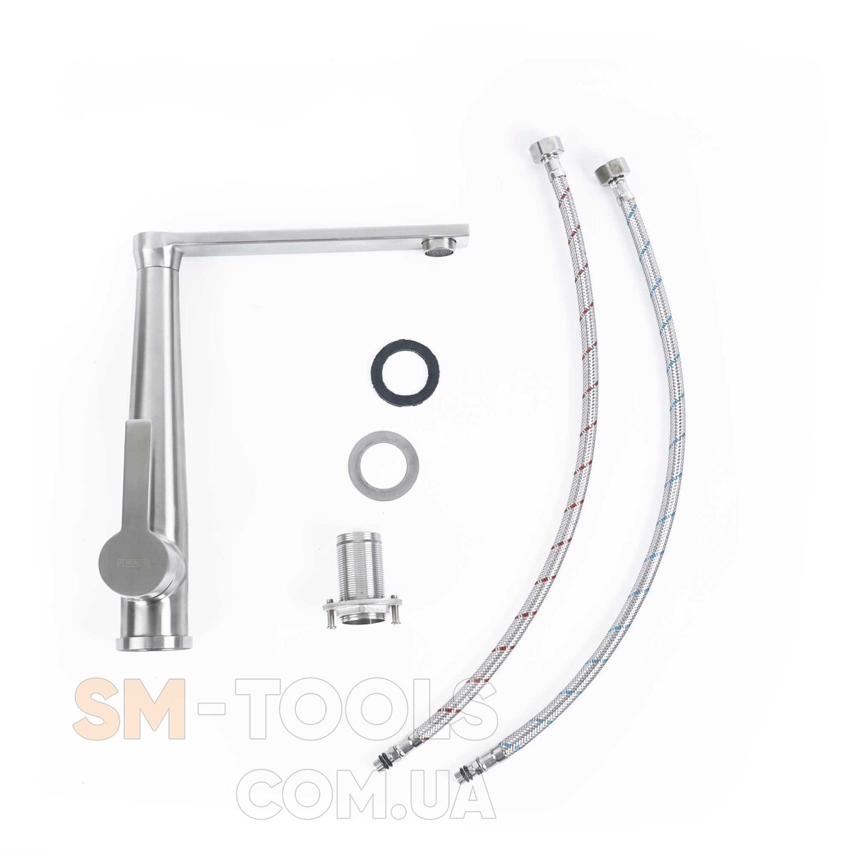 Два шланги довжиною 50 см дозволяють зручно приєднати змішувач до водопроводу. Комплектація включає шланги, кріплення та прокладку, що спрощує процес монтажу та забезпечує надійну фіксацію.