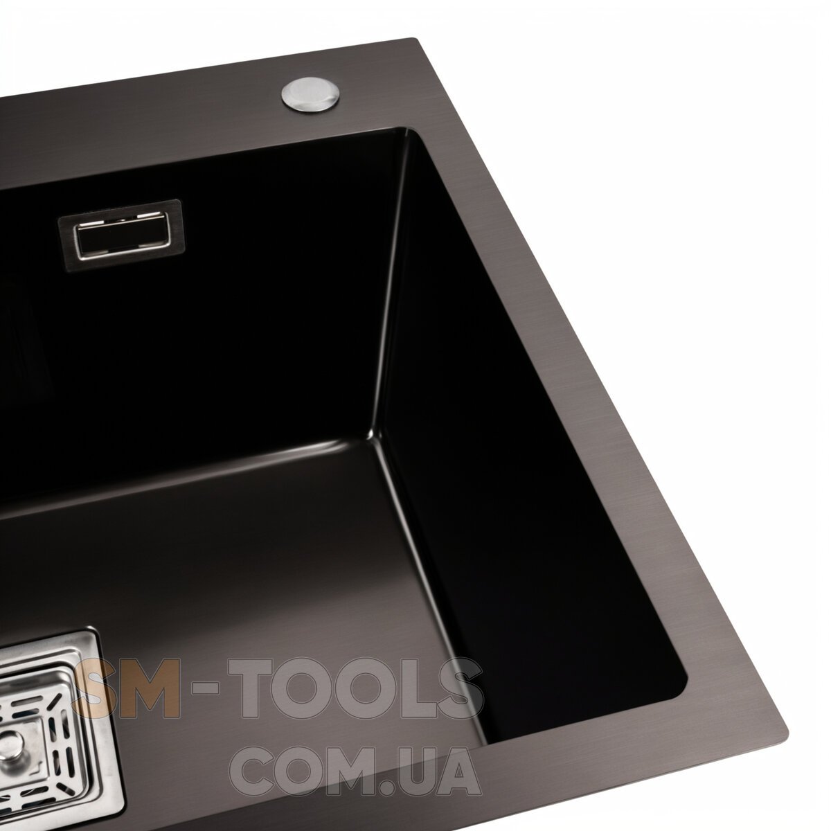 Характеристики Кухонна мийка Platinum Handmade PVD 580х430х220 чорна (товщина 3,0/1,0 мм квадратний сіфон)