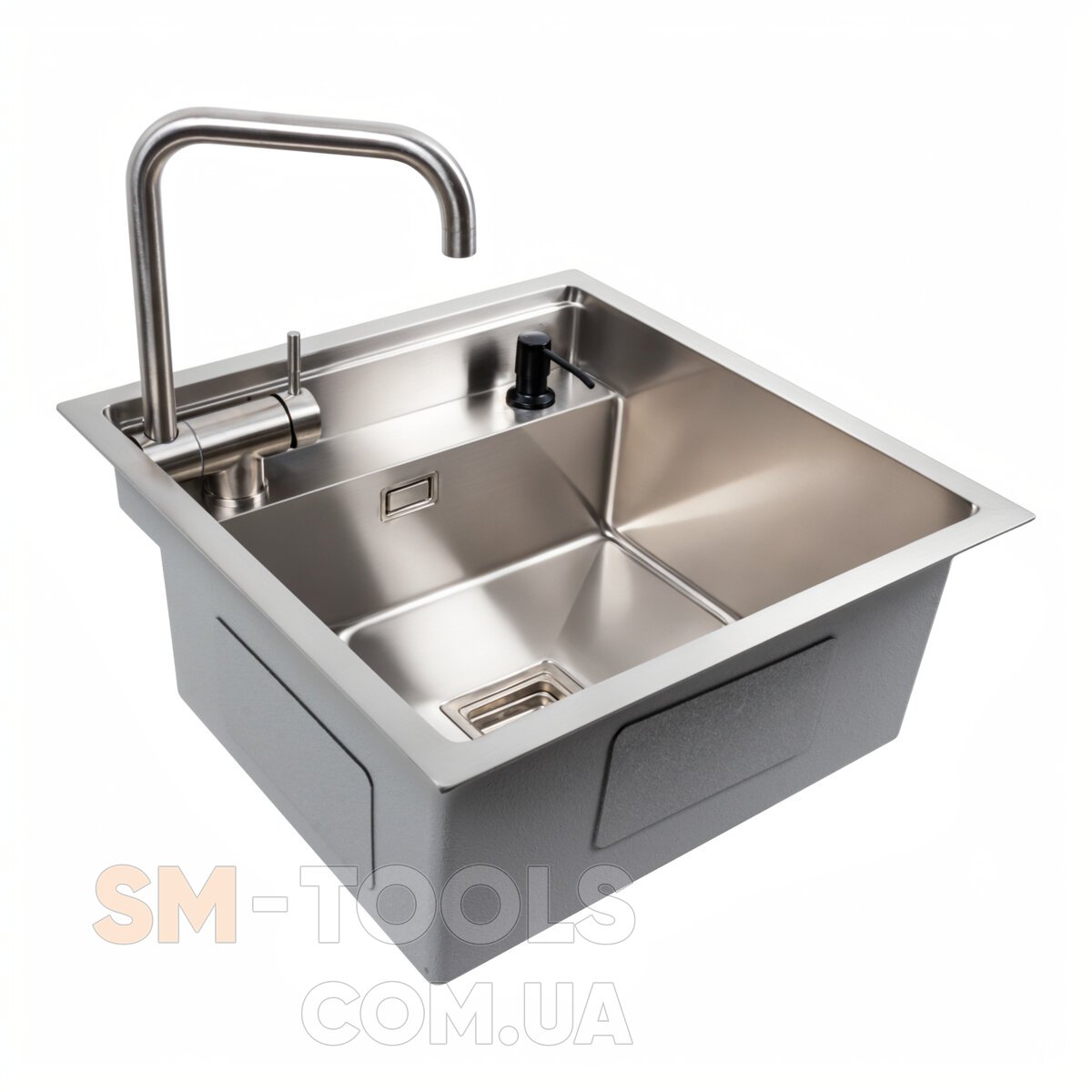 Розміри мийки 500х500х200 мм і розміри чаші 445х355х200 мм роблять її ідеальною для будь-якої кухні, надаючи оптимальне простірне розташування. Завдяки комплектації, яка включає кришку, змішувач, сифон, корзину, дозатор і кріплення, у вас буде все необхідне для зручного та ефективного використання мийки.