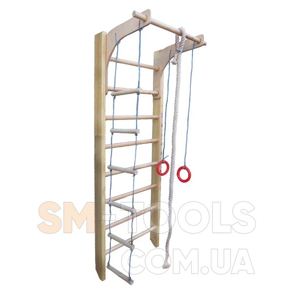 - Состав спортивного уголка: шведская стенка с верхним турником, веревочный набор (кольца, канат, веревочная лесенка);