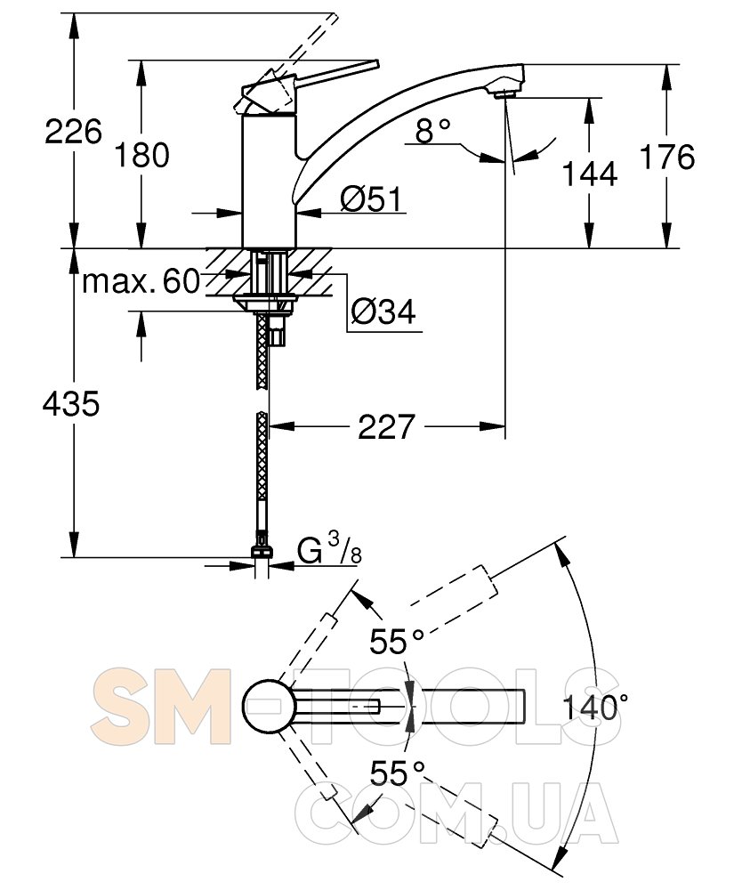 Вилив змішувача має кут повороту 140 градусів - відмінне рішення для невеликих кухонь з малою кількістю вільного простору. Управління здійснюється за допомогою надійної рукоятки, а всередині змішувача захований керамічний картридж GROHE SilkMove, який пропонує точне та плавне керування температурою та напорами води.
