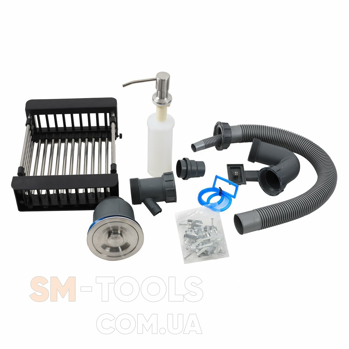 Комплектація мийки: сифон, кріплення, дозатор, корзина.