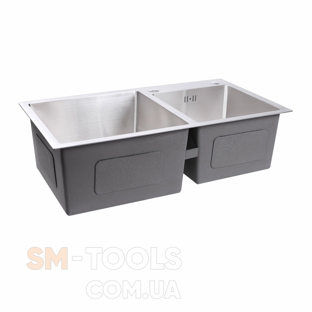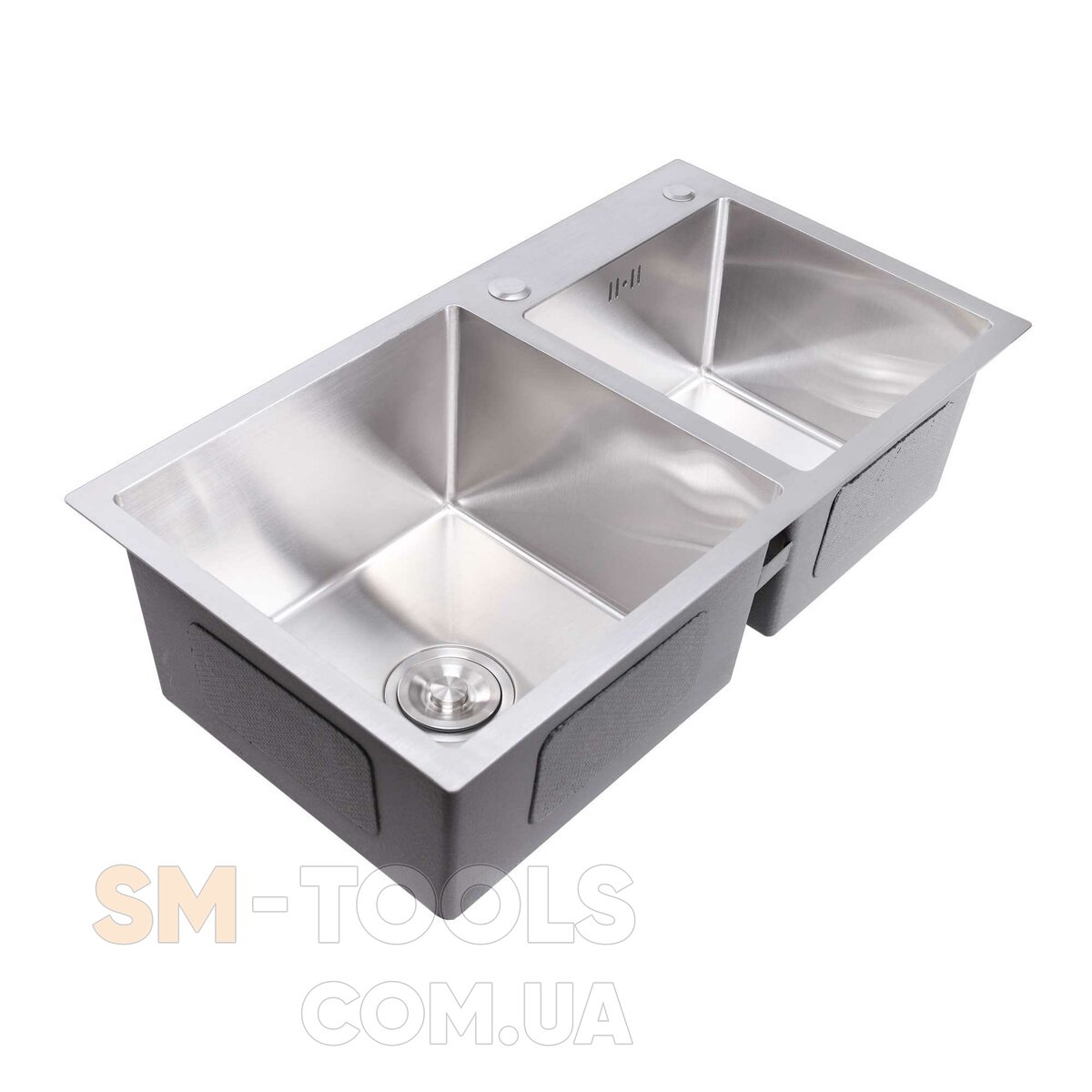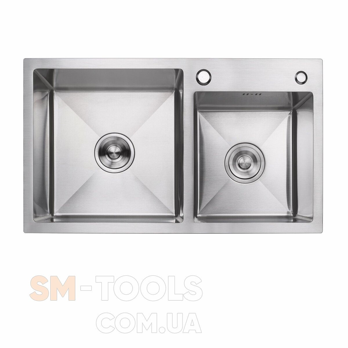 Кухонна мийка 75*41 нержавійка на дві чаші Platinum Handmade (круглий сифон, 3.0/0.8)