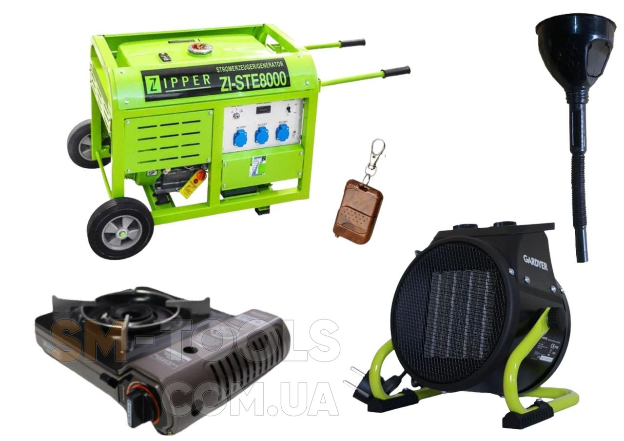 Опис Бензиновий генератор Zipper ZI-STE8000 + газова плитка Orcamp CK-505 + електричний обігрівач Gardyer HE2000