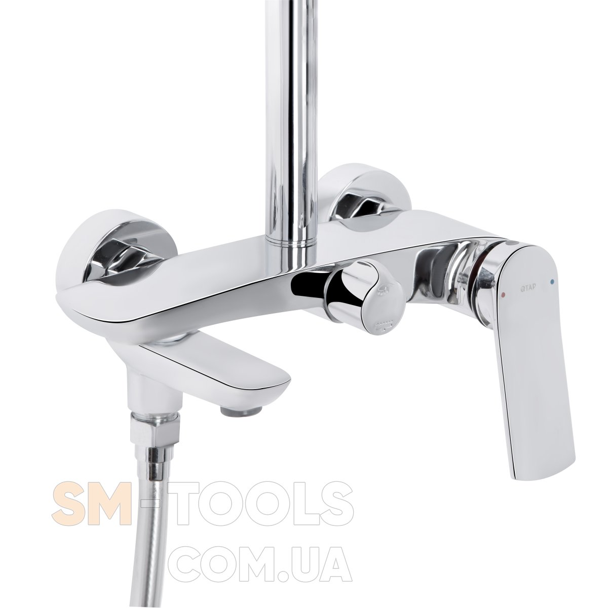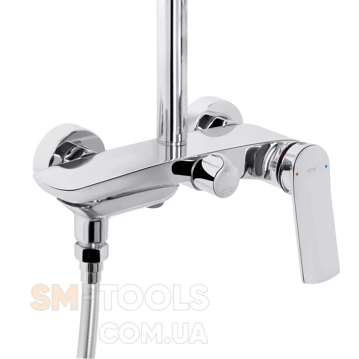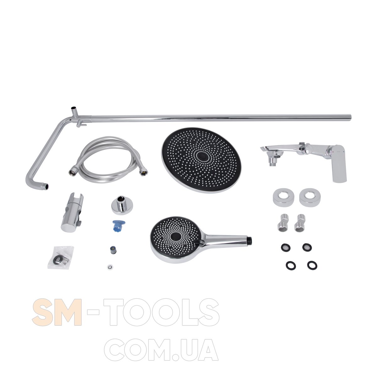 Комплектація : Змішувач, кронштейн для верхнього душу, лійка для верхнього душу, кронштейн для ручного душу, лійка для ручного душу, душовий шланг, душова стійка, деталі кріплення.