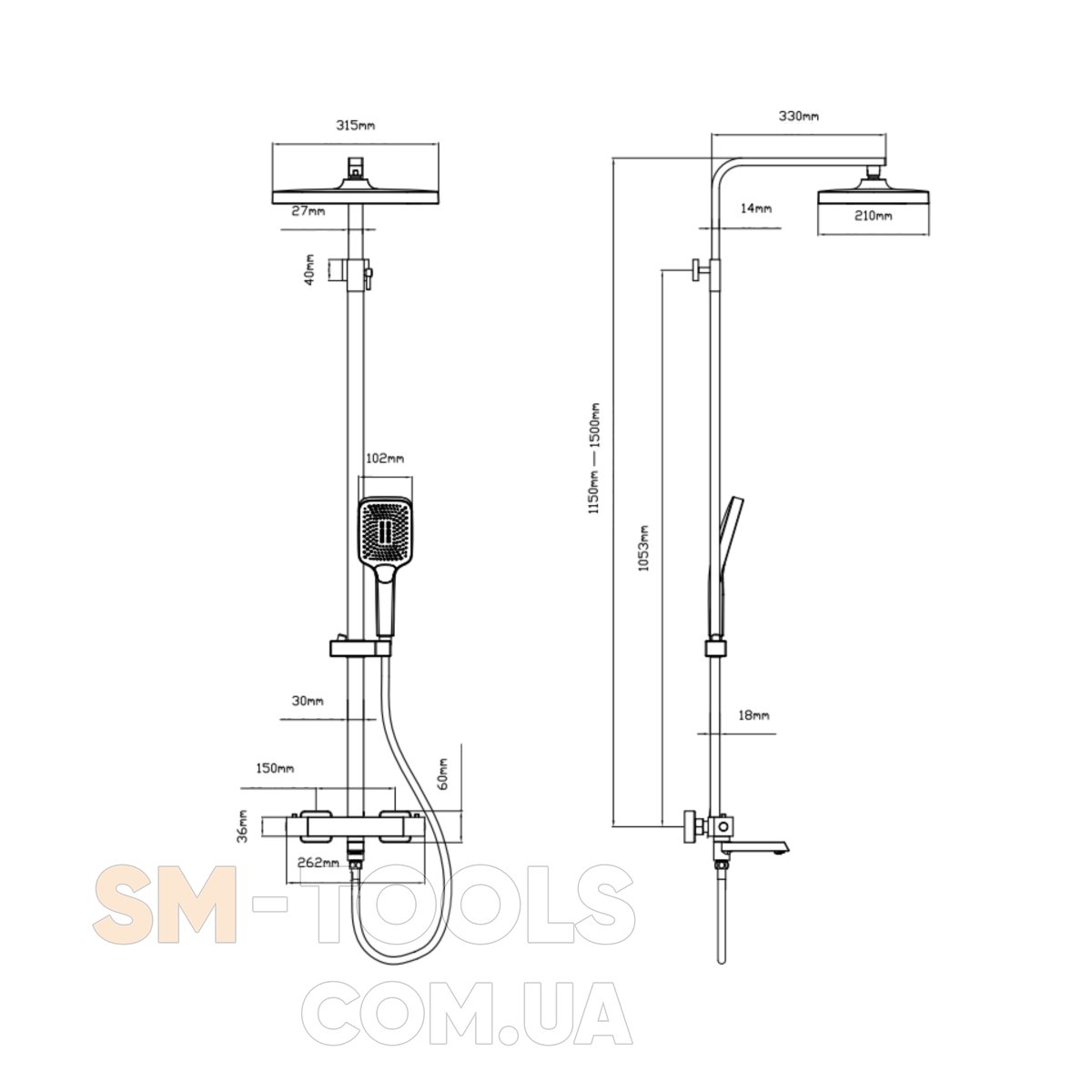 Діаметр лійки, мм : Ручний душ: 102х110. Верхній душ: 315х210