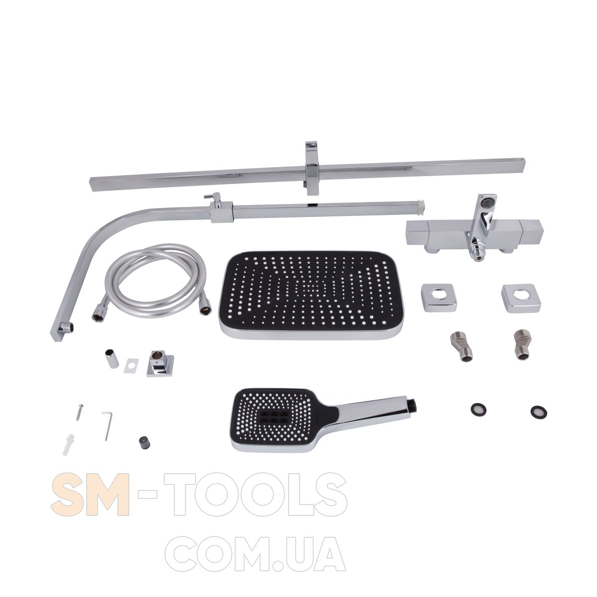 Комплектація : Змішувач, кронштейн для верхнього душу, лійка для верхнього душу, кронштейн для ручного душу, лійка для ручного душу, душовий шланг, душова стійка, деталі кріплення.
