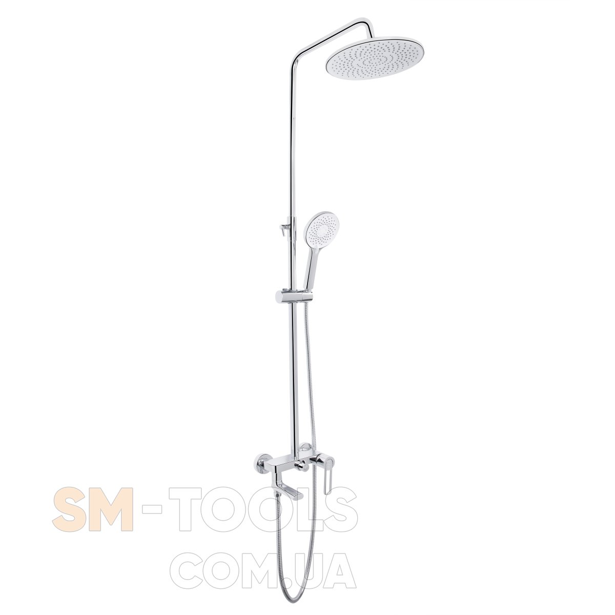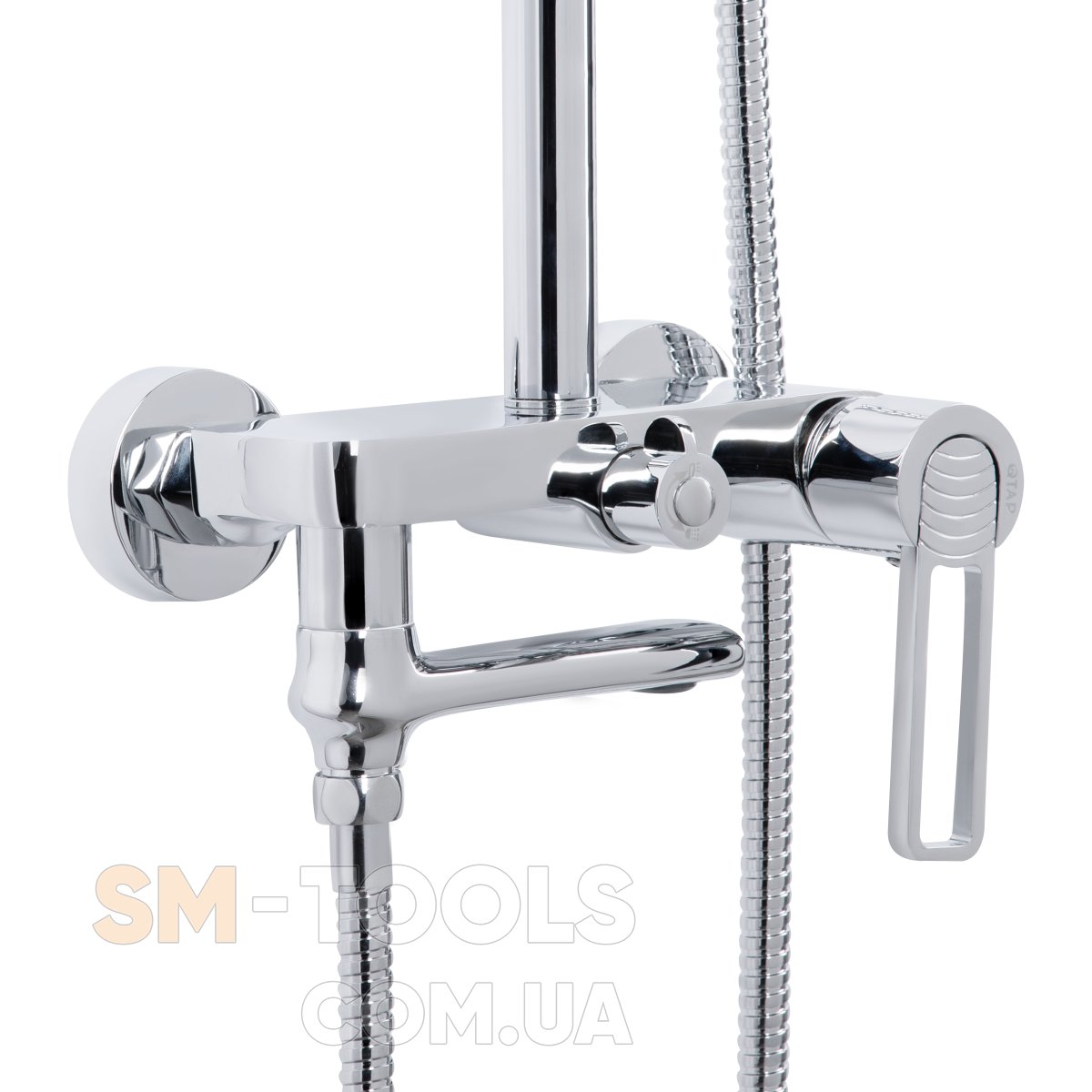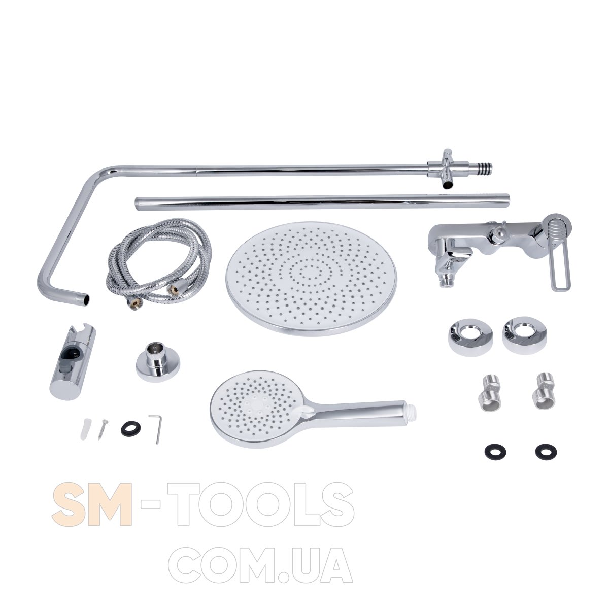 Комплектація : Змішувач, кронштейн для верхнього душу, лійка для верхнього душу, кронштейн для ручного душу, лійка для ручного душу, душовий шланг, душова стійка, деталі кріплення.