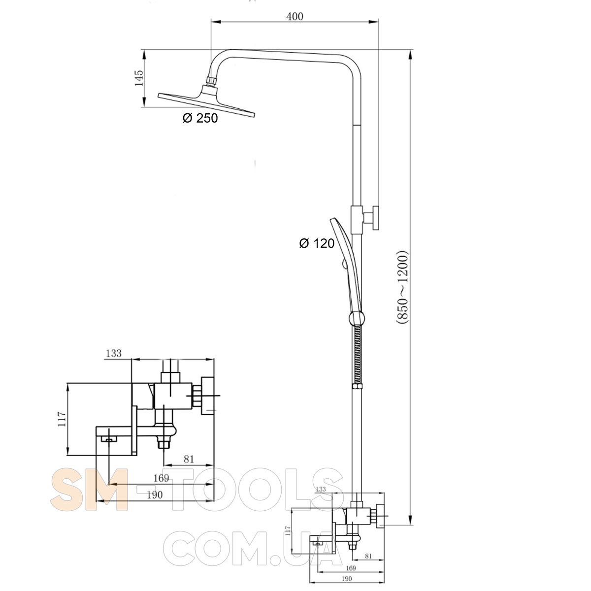 Діаметр лійки, мм : Ручний душ: 120. Верхній душ: 250