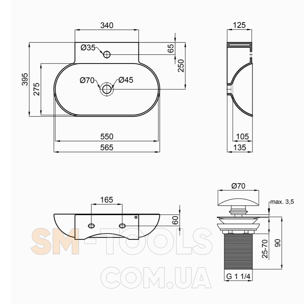 Габаритні розміри виробу (ШхГхВ), мм : 565х395х135 – раковина; 70х70х225 - донний клапан