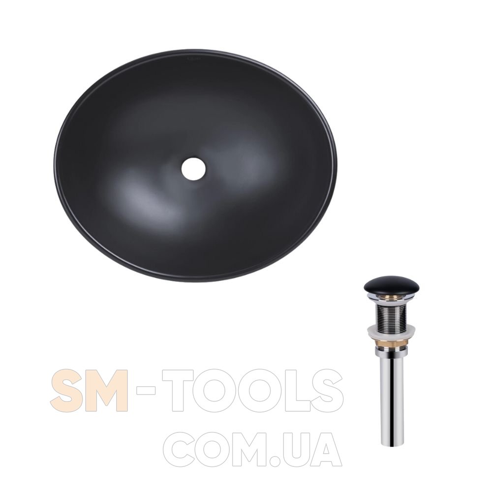 Комплект Qtap Dove: Раковина накладна овальна 410x335x145 мм Matt Black + Донний клапан PU03