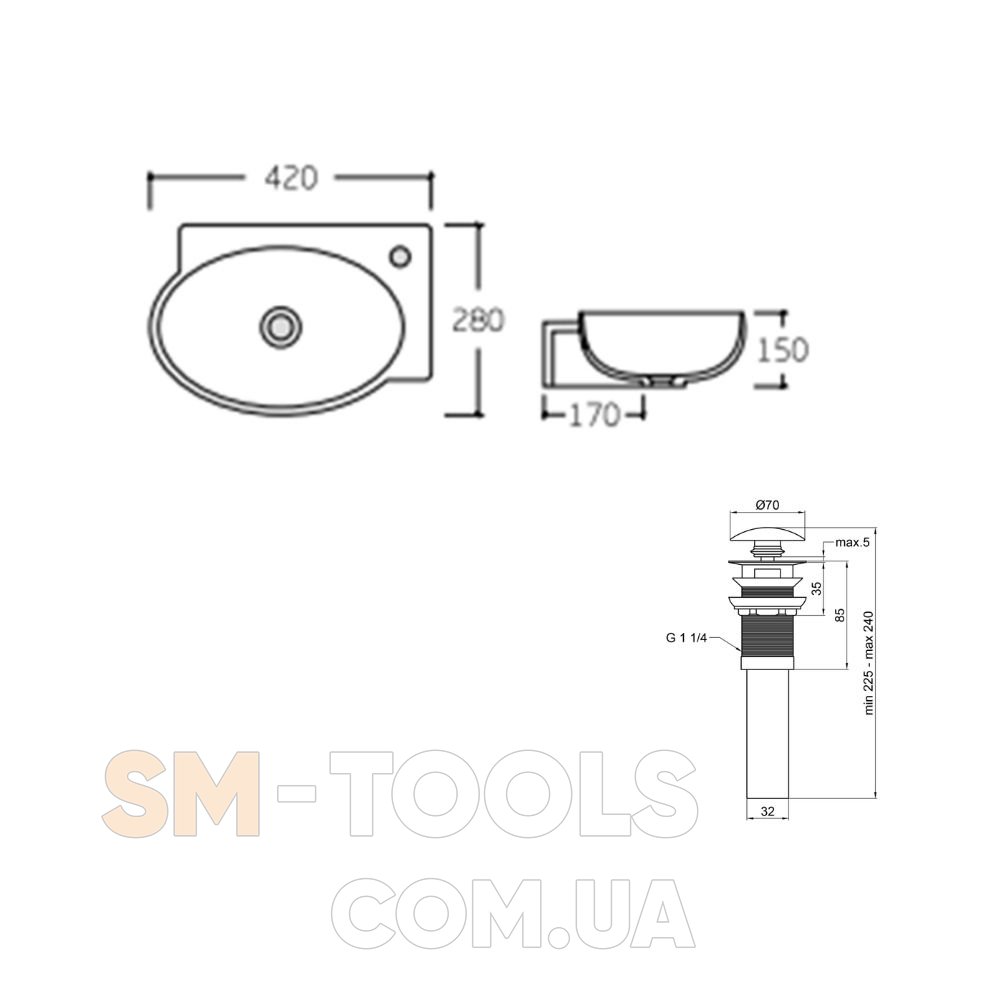 Габаритні розміри виробу (ШхГхВ), мм : 420х280х150 – раковина; 70х70х225 - донний клапан