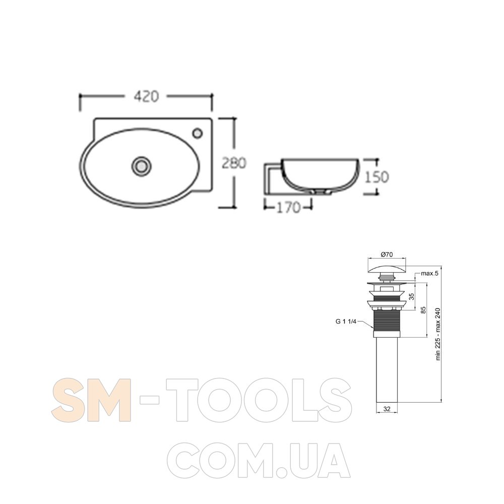 Габаритні розміри виробу (ШхГхВ), мм : 420х280х150 – раковина; 70х70х225 - донний клапан