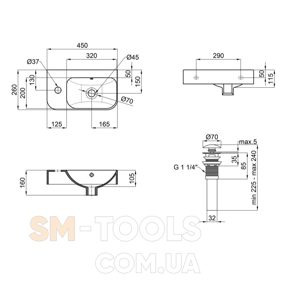 Габаритні розміри виробу (ШхГхВ), мм : 450х250х158 – раковина; 70х70х225 - донний клапан