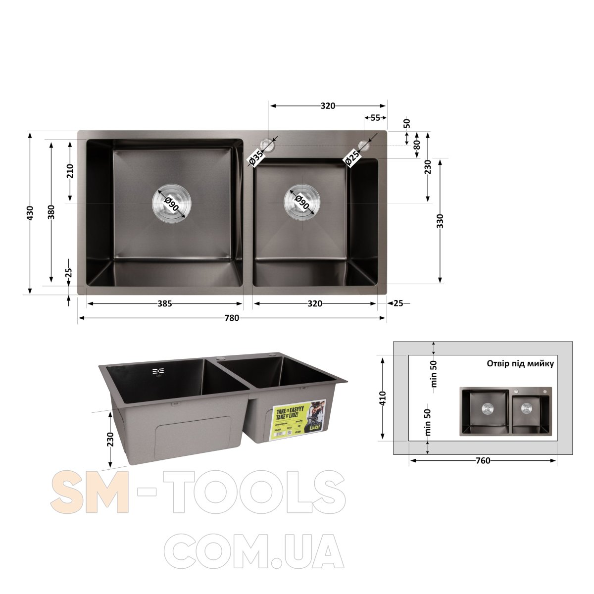 Характеристики Мийка для кухні з двома чашами інтегрована Lidz Handmade H7843 (LDH7843BPVD45586) Brushed Black PVD 3,0/1,0 мм
