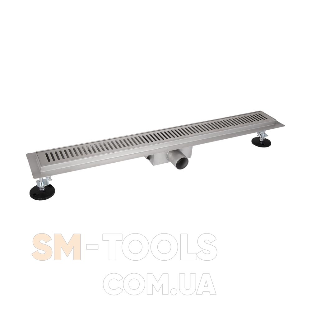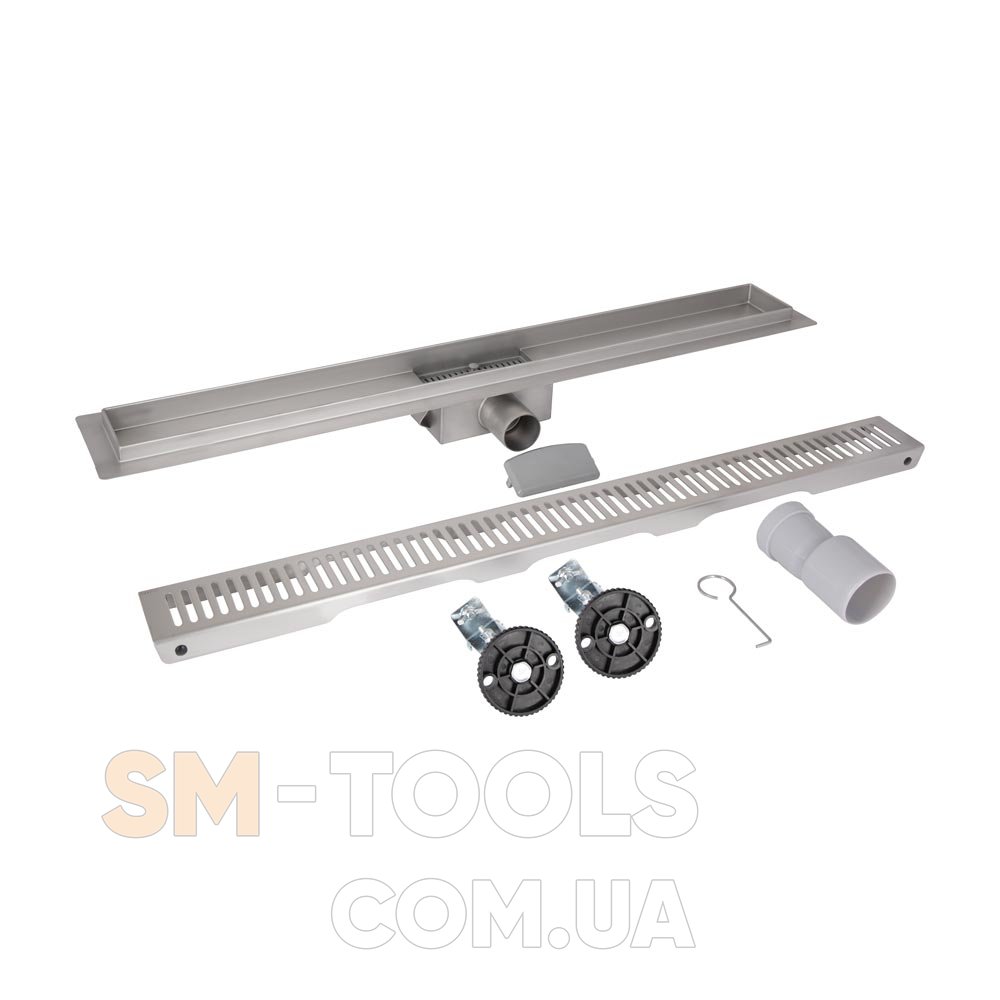 Комплектація : Трап, лоток сухого затвора, ґрати, ніжки (2 шт), перехідник у каналізацію 40/50 мм, гідроізоляція, гачок для ґрат.