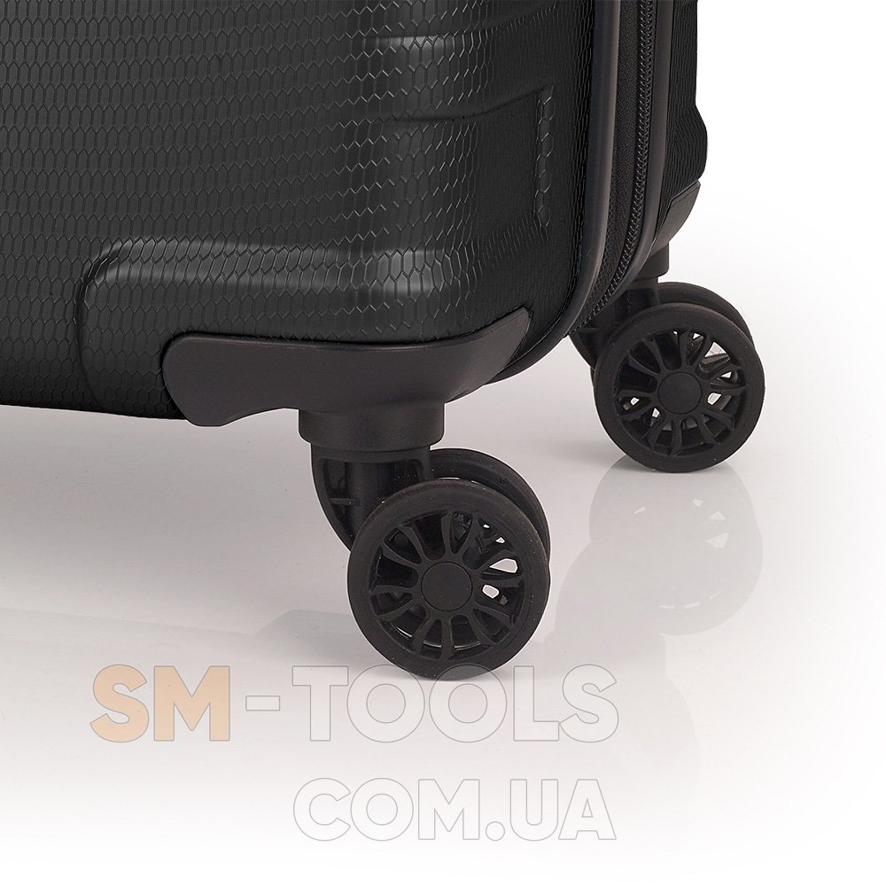 Валіза оснащена чотирма здвоєними колесами з можливістю розвороту на 360°. Конструкція забезпечує рівномірний перерозподіл навантаження на кожне колесо, що сприяє плавному руху та маневреності валізи. Колеса виготовлені з термопластичного поліуретану (TPU). Цей матеріал має міцність порівнянну з пластиком, гнучкістю силікону, а також підвищену стійкість до перепадів температури та стирання. Завдяки цьому колеса мають тривалий термін експлуатації. Відмінною особливістю коліс із TPU-матеріалу є зниження шуму до мінімуму під час руху валізи нерівною поверхнею.