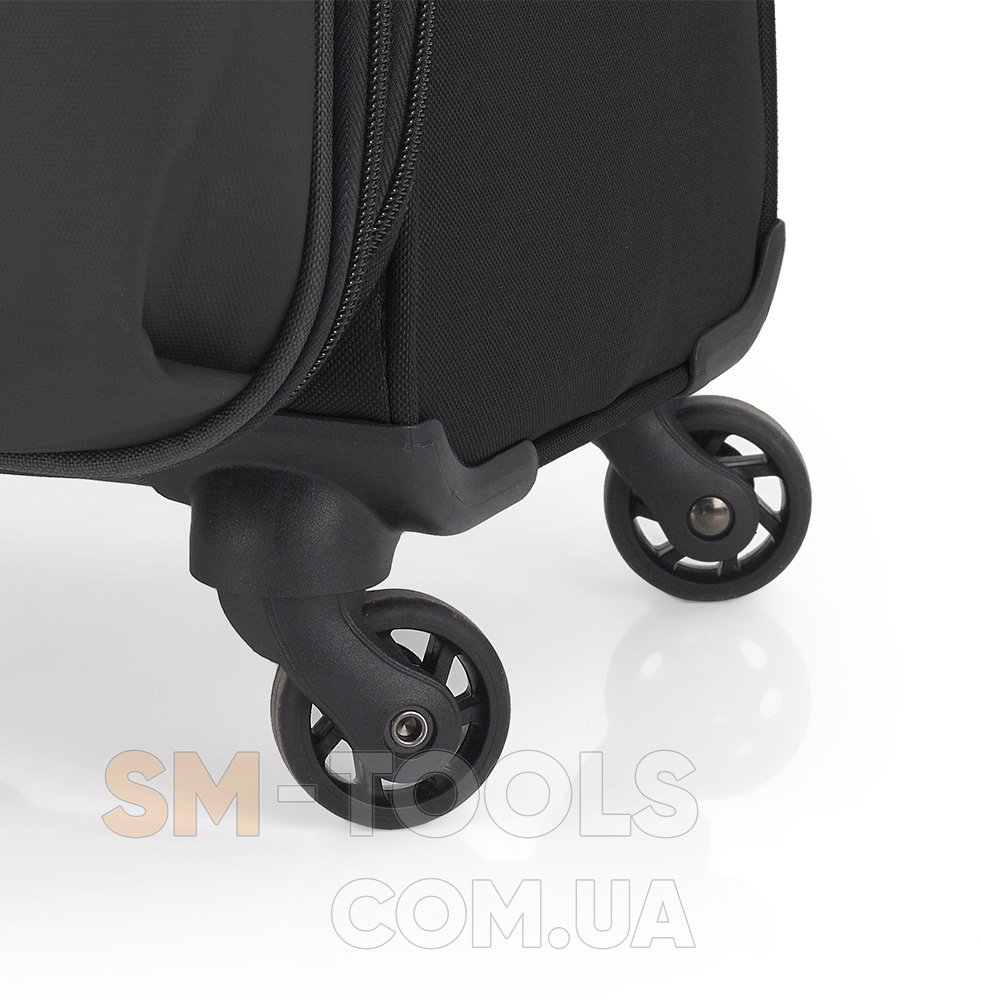 Валіза оснащена чотирма колесами з можливістю розвороту на 360°. Конструкція забезпечує рівномірний перерозподіл навантаження на кожне колесо, що сприяє плавному руху та маневреності валізи. Колеса виготовлені з термопластичного поліуретану (TPU). Цей матеріал має міцність порівнянну з пластиком, гнучкістю силікону, а також підвищену стійкість до перепадів температури та стирання. Завдяки цьому колеса мають тривалий термін експлуатації. Відмінною особливістю коліс із TPU-матеріалу є зниження шуму до мінімуму під час руху валізи нерівною поверхнею.