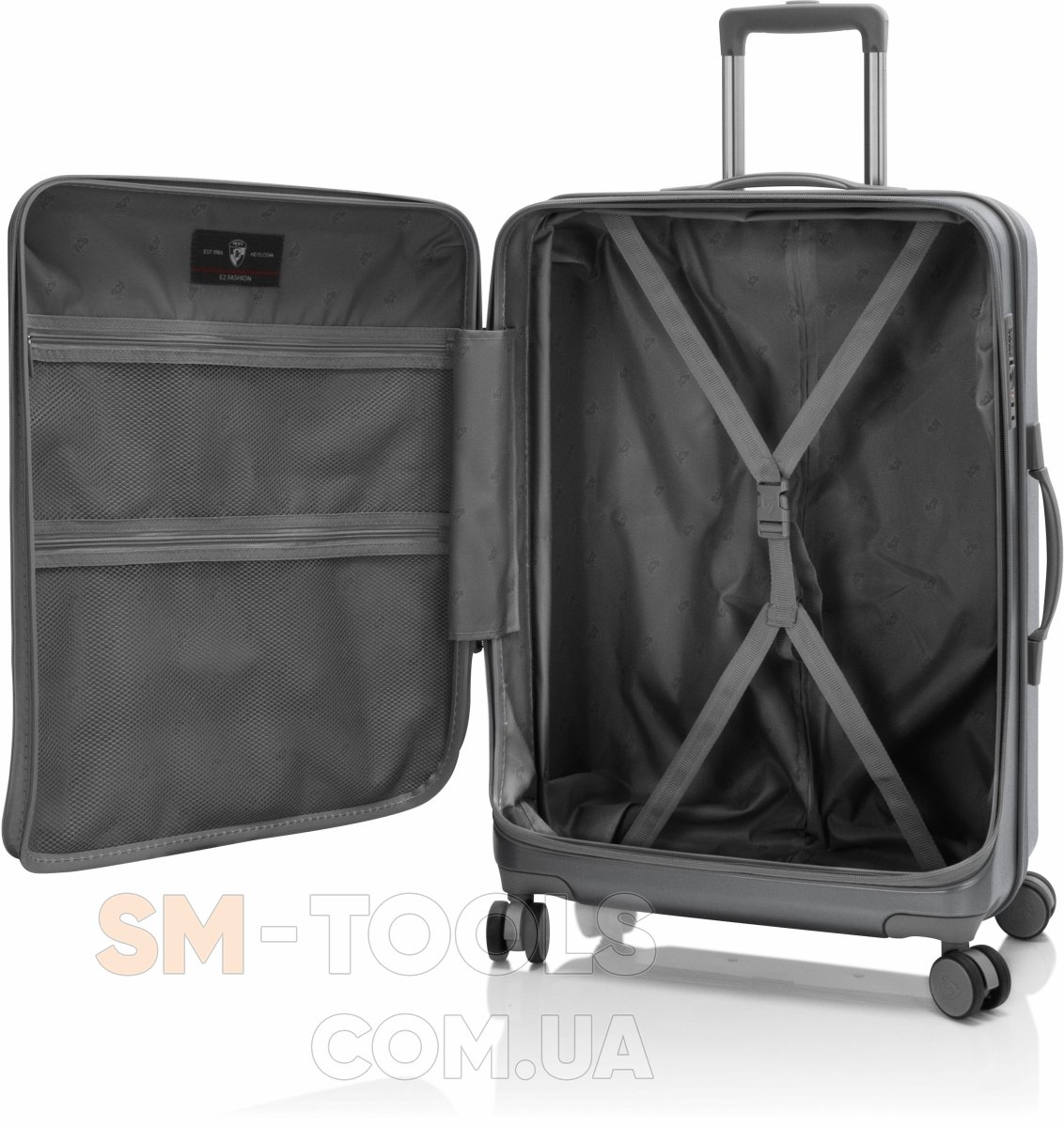 Валіза Heys EZ Fashion (M) Charcoal (10162-0047-26) на відміну від традиційної конструкції з розділенням 50/50, яка зустрічається в більшості жорстких валіз, відрізняється системою відкривання спереду. Це дає можливість пакування речей вглибину, використовуючи передній клапан. Виготовлена з полікарбонатного композиту: легкого, міцного та ударостійкого матеріалу. Зовнішня поверхня має легке тиснення, що запобігає появі подряпин й потертостей. Внутрішня частина повністю на підкладці. Основне відділення має два еластичні ремені для фіксації речей, що закріплюються застібкою. Також є дві сітчасті кишені для зберігання необхідних дрібниць. Є можливість збільшити корисний об єм валізи до 20% завдяки наявності розширювального клапана.