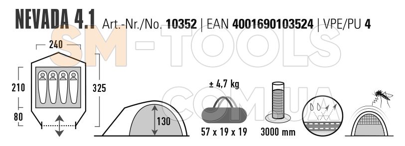 High Peak Nevada 4.1 Deep Forest (10352) - чотиримісний купольний намет із тамбуром для зберігання туристичного спорядження. Модель має алюмінізоване покриття зовнішнього тенту, яке зміцнює тканину та знижує підвищення температури всередині в сонячну погоду. Намет оснащений екологічно чистим водовідштовхувальним DWR-просоченням без PFC елементів. Високоефективна система вентиляції Advanced Low Vent System забезпечує оптимальну циркуляцію повітря навіть у дощові дні. Достатня відстань між внутрішнім наметом і зовнішнім тентом суттєво зменшує утворення конденсату. Затемнена спальня не пропускає яскраве світло, дозволяючи виспатися всім, хто пізно прокидається. Система вентиляції внутрішнього намету Vario Vent Control забезпечує регульований потік свіжого повітря, щоб ви могли виспатися ще краще. Всі шви дна і тенту проклеєні спеціальною стрічкою, гарантуючи захист від проникнення вологи в дощову погоду. В наметі зможуть без проблем розміститися три-чотири людини з усім спорядженням. Намет чотиримісний High Peak Nevada 4.1 Deep Forest (10352) завжди буде чудовим вибором у співвідношенні ціни та якості.
