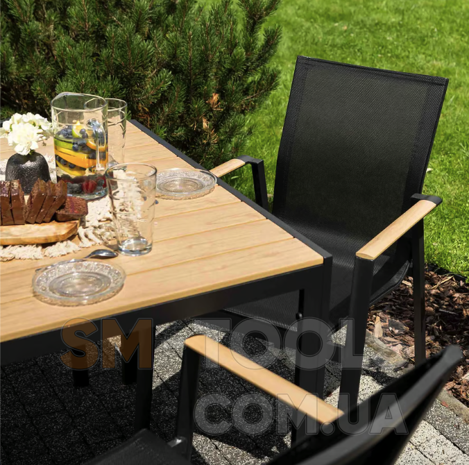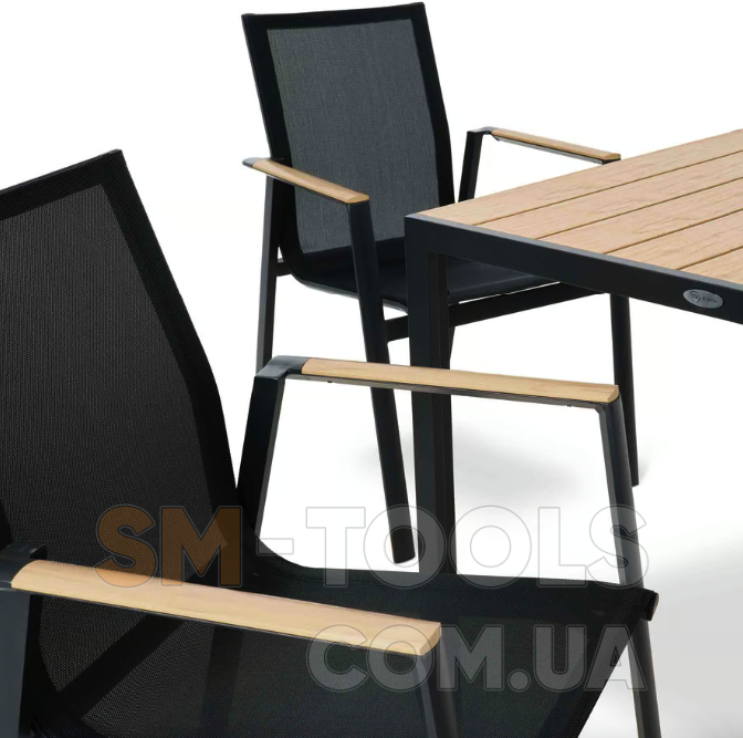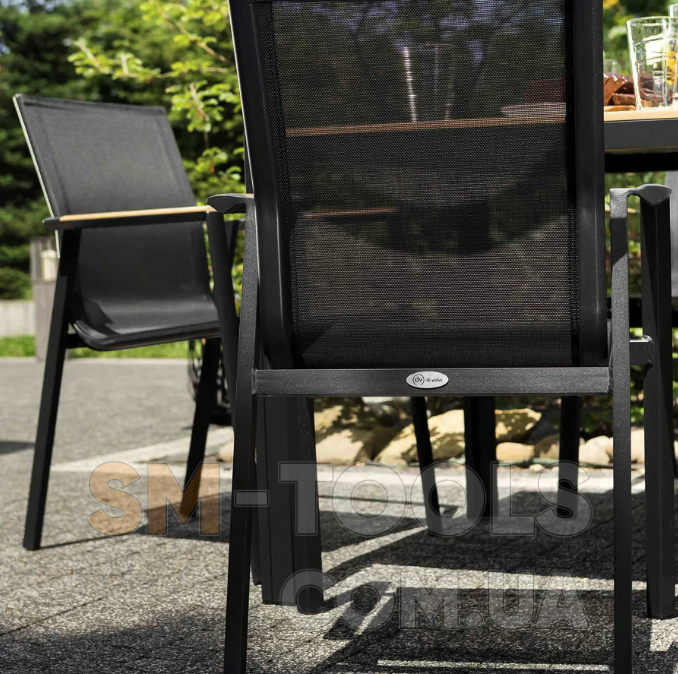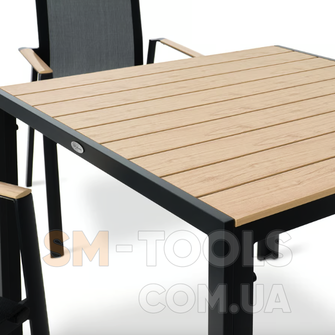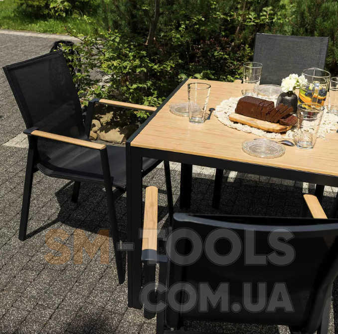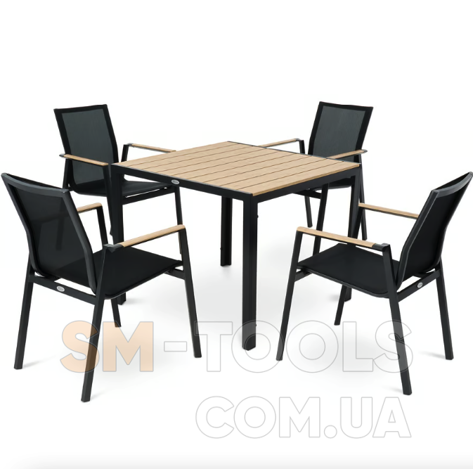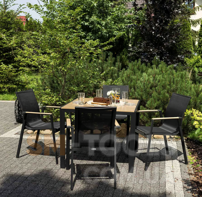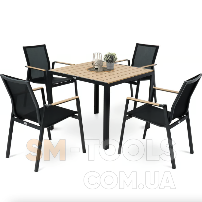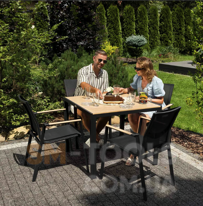 Чотиримісний комплект садових меблів Cremo від Di Volio дозволить вам створити комфортний і стильний простір для відпочинку і обіду на свіжому повітрі. Набір складається з квадратного столу з дерев'яною стільницею і чотирьох стільців з практичними підлокітниками. Меблі характеризуються акуратними розмірами, що робить набір Cremo чудовим вибором як для великих, так і для менших садів або терас. Завдяки використанню міцних матеріалів меблі не псуються, не тріскаються і не втрачають колір протягом багатьох років використання, навіть піддаючись різним погодним умовам. Сучасний дизайн меблів, що поєднує прості форми і кольори, обмежені матовим чорним і натуральним бежевим, надає меблям елегантний вигляд і універсальний характер, завдяки чому вони можуть стати чудовою основою для будь-якого облаштування зовнішнього простору будинку, незалежно від його стилю.
