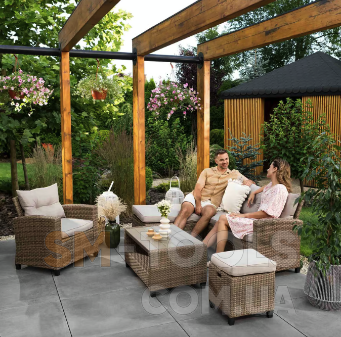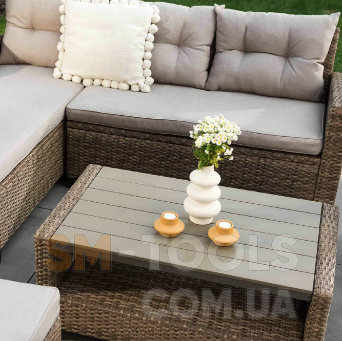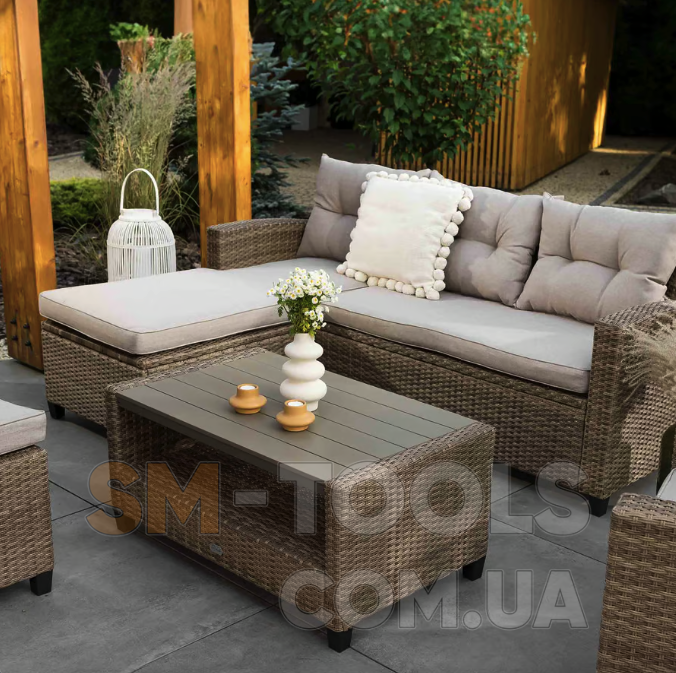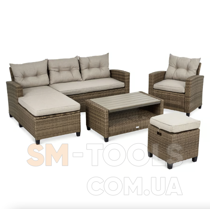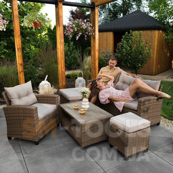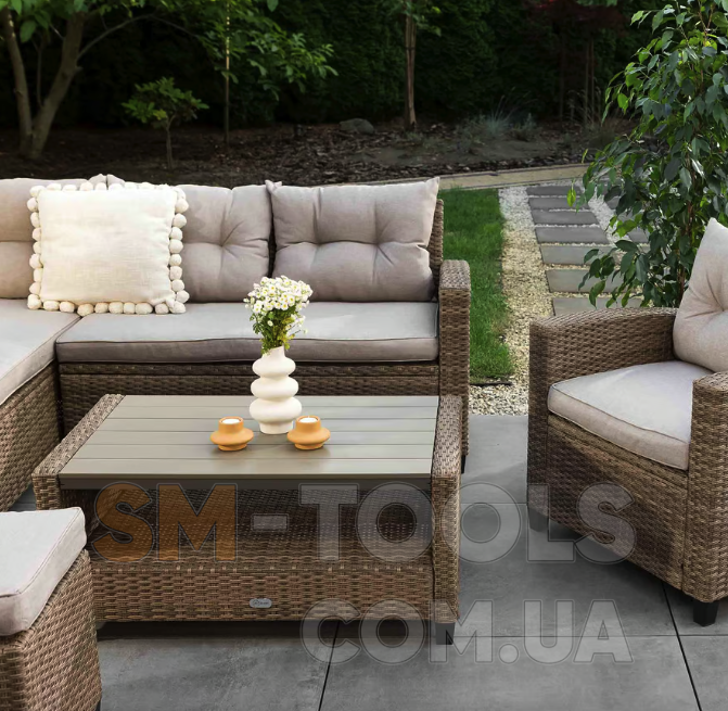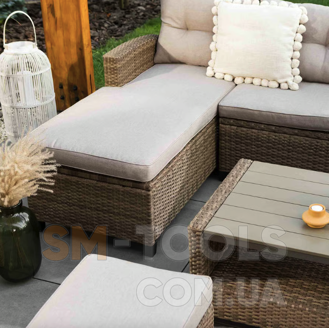 Садові меблі Dalmia є ідеальною пропозицією для людей, які цінують комфорт, стиль і функціональність в облаштуванні відкритих просторів. Комплект складається з чотиримісного кутового дивана, крісла з підлокітниками, табурета, який також можна використовувати як додаткове сидіння, журнального столика. Кутовий диван можна встановити двома способами - як лівостороннім, так і правостороннім, що дозволяє ідеально підібрати меблі до будь-якого простору саду або тераси. Комплект виготовлений з високоякісного техноротангу натурального бежевого відтінку, дуже міцний і стійкий до погодних умов. Сидіння і спинки кутового дивана і крісла оснащені м'якими подушками, які забезпечують комфорт під час сидіння. Дизайн меблів, заснований на простоті форм і модних, стриманих тонах, надає гарнітуру Dalmia елегантний і сучасний вигляд. Конструкція меблів Dalmia поєднує в собі міцний сталевий каркас і плетене полотно з техноротангу. У комплект також входить флісовий плед, що стане в нагоді у прохолодні вечори, забезпечуючи додатковий комфорт і затишок.