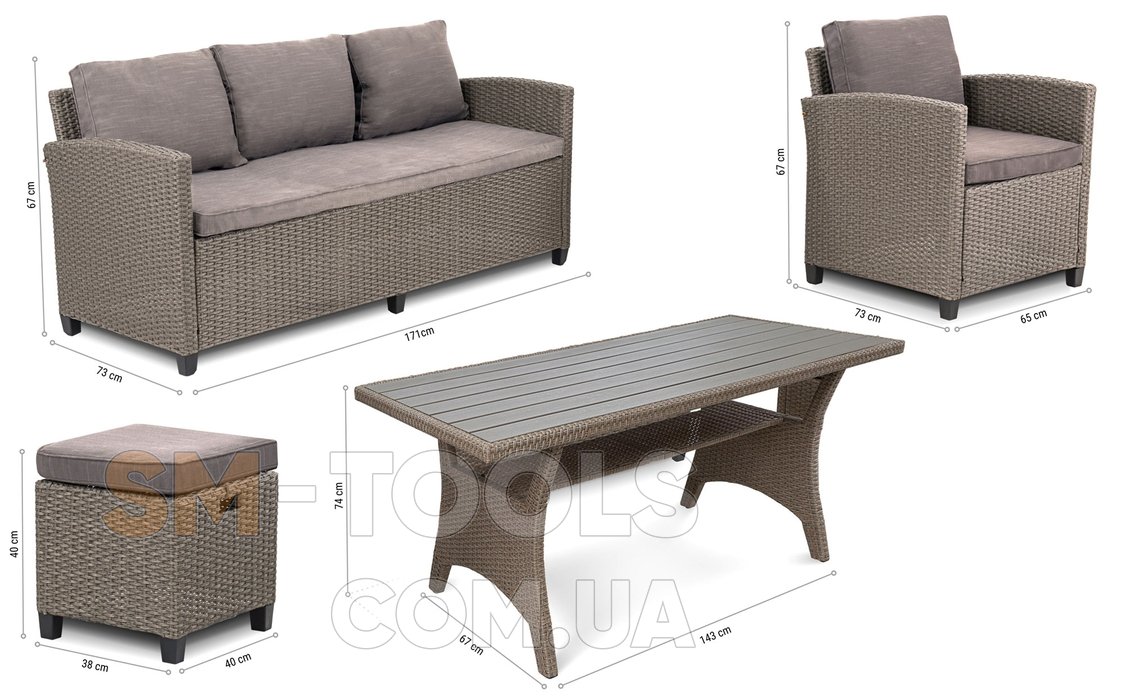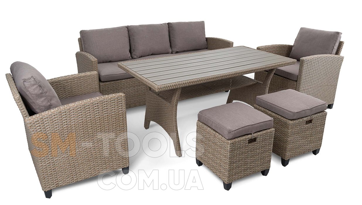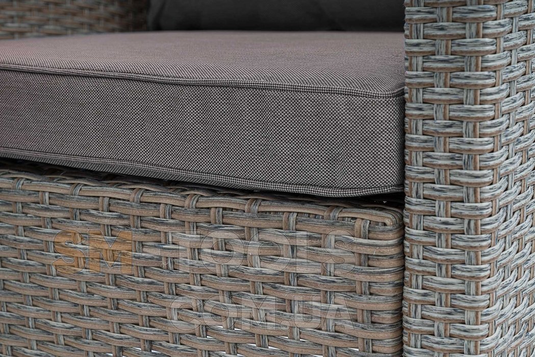 Купити садові меблі Di Volio Genova з ротанга - означає стати власником не тільки приголомшливо витонченого, але й неймовірно надійного набору, адже він - продукт італійської марки Di Volio, яка на цілий світ відома високою якістю своїх матеріалів та дивовижною естетичністю готових товарів. Плануючи замовити садові меблі з ротанга від Di Volio, будьте впевнені у своїй потенційній покупці, оскільки виробник забезпечує її потрібною сертифікацією та гарантією обслуговування на 24 місяці. У комплект садових меблів Di Volio Genova входить великий тримісний диван, два зручні крісла, два невеликі пуфи, широкий стіл, 7 подушок для сидіння, 5 подушок для спинок та набір кріпильних елементів для самостійного збирання.
