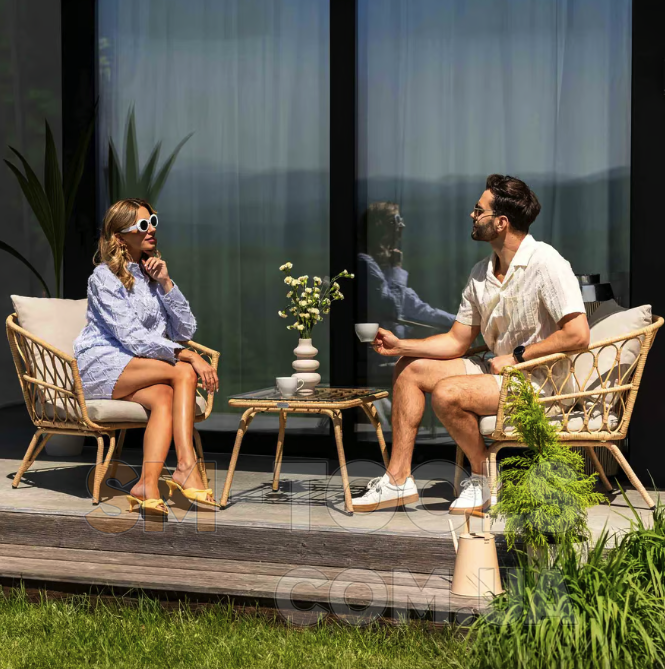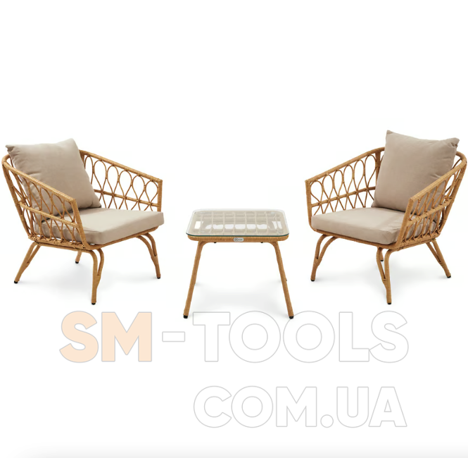 Двомісний балконний комплект Savona - це унікальне поєднання класики та сучасності. В основі меблевої конструкції лежить міцний сталевий каркас, обплетений округлими високоякісними волокнами техноротанга. Ажурне плетіння в ніжному бежевому кольорі додає меблям легкості та надає їм характерний стиль і природний вигляд, натхненний традиційними меблями з ротанга та лози. У комплект входять два зручних крісла з округлою спинкою, подушки кремового кольору і журнальний столик зі скляною стільницею. Завдяки акуратним розмірам комплект меблів Savona чудово підійде не тільки в саду і на терасі, але і на невеликому балконі.