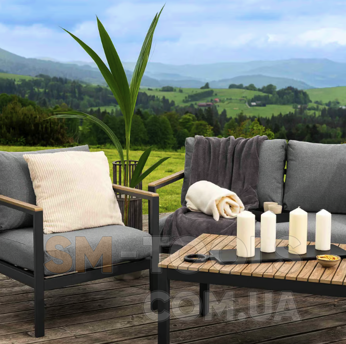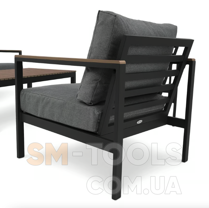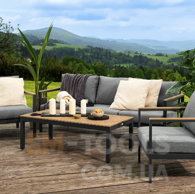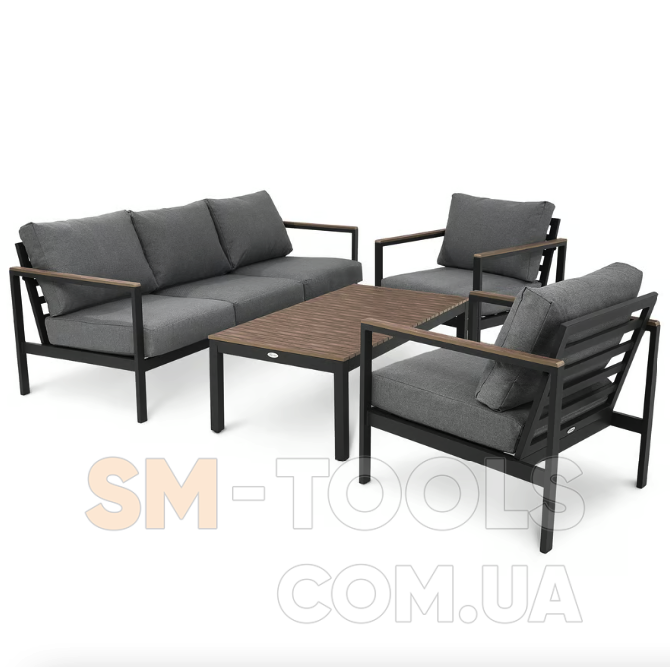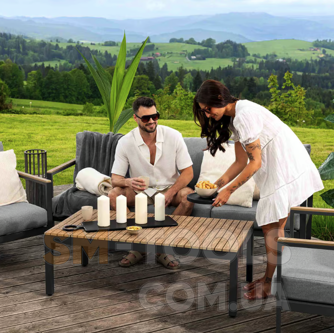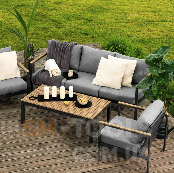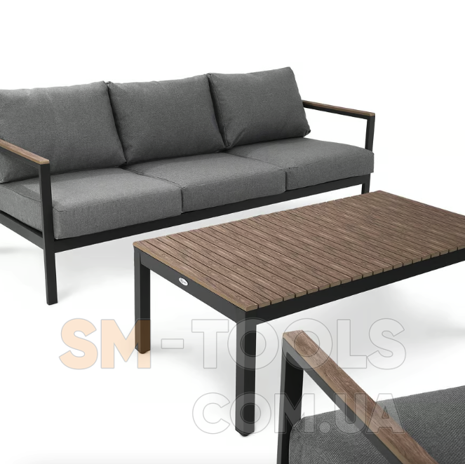 Садові меблі Tivoli були створені з урахуванням комфорту використання, функціональності та елегантності. Набір, що включає тримісний диван, два крісла та журнальний столик, ідеально підійде для облаштування вашого саду або тераси, створить місце для відпочинку та проведення часу з близькими. Конструкція меблів поєднує легкий алюмінієвий каркас з елементами з сучасного полівуд матеріалу, що імітує дерево. Такі матеріали гарантують довговічність, стійкість до погодних умов і стильний зовнішній вигляд меблів. Комплект доповнений м'якими подушками графітового кольору. Завдяки універсальному та позачасовому дизайну меблі Tivoli чудово виглядають як у традиційно, так і в сучасно оформлених приміщеннях.