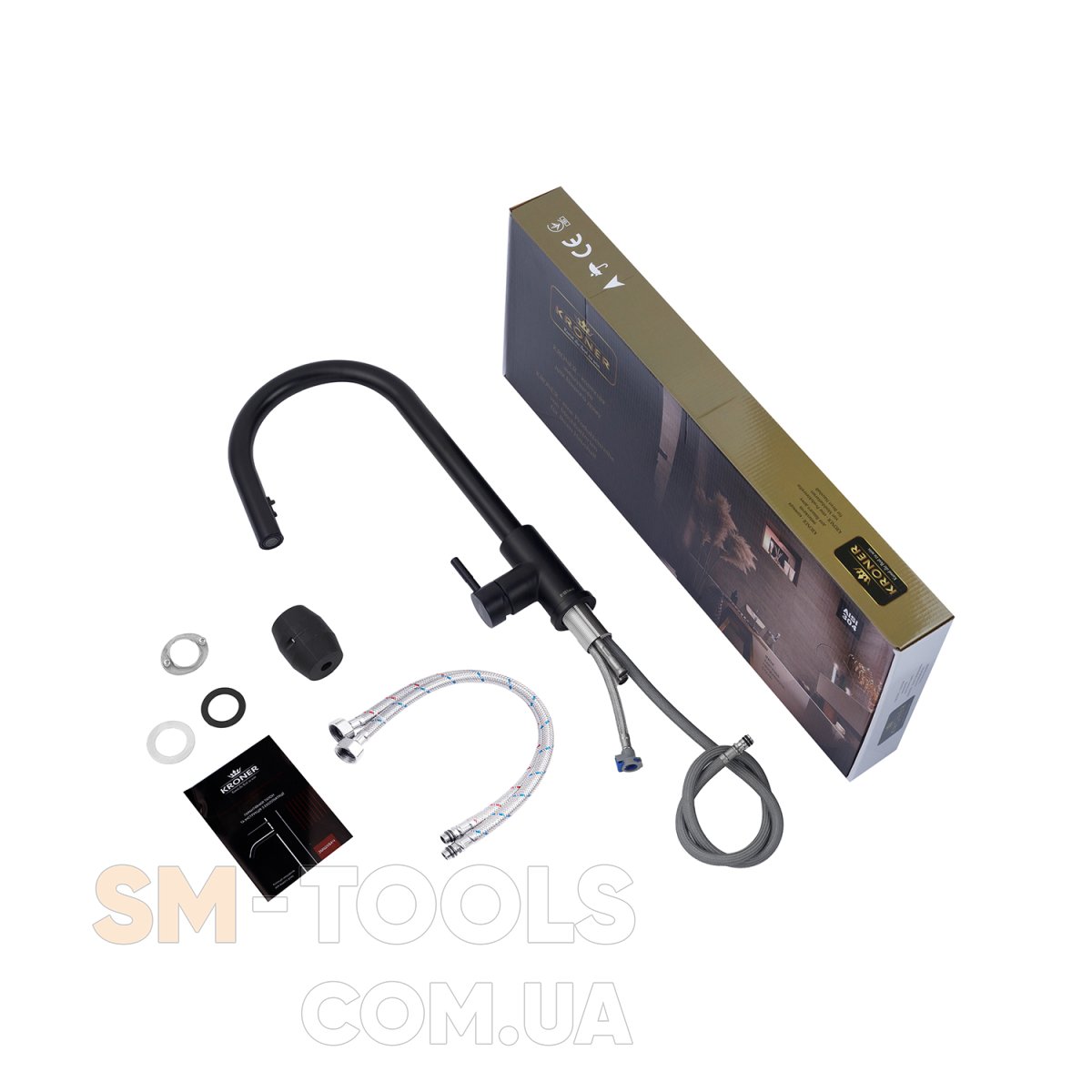 Комплектація : Змішувач, гнучка підводка, шланг для висувної лійки, лійка, якір, кріплення.
