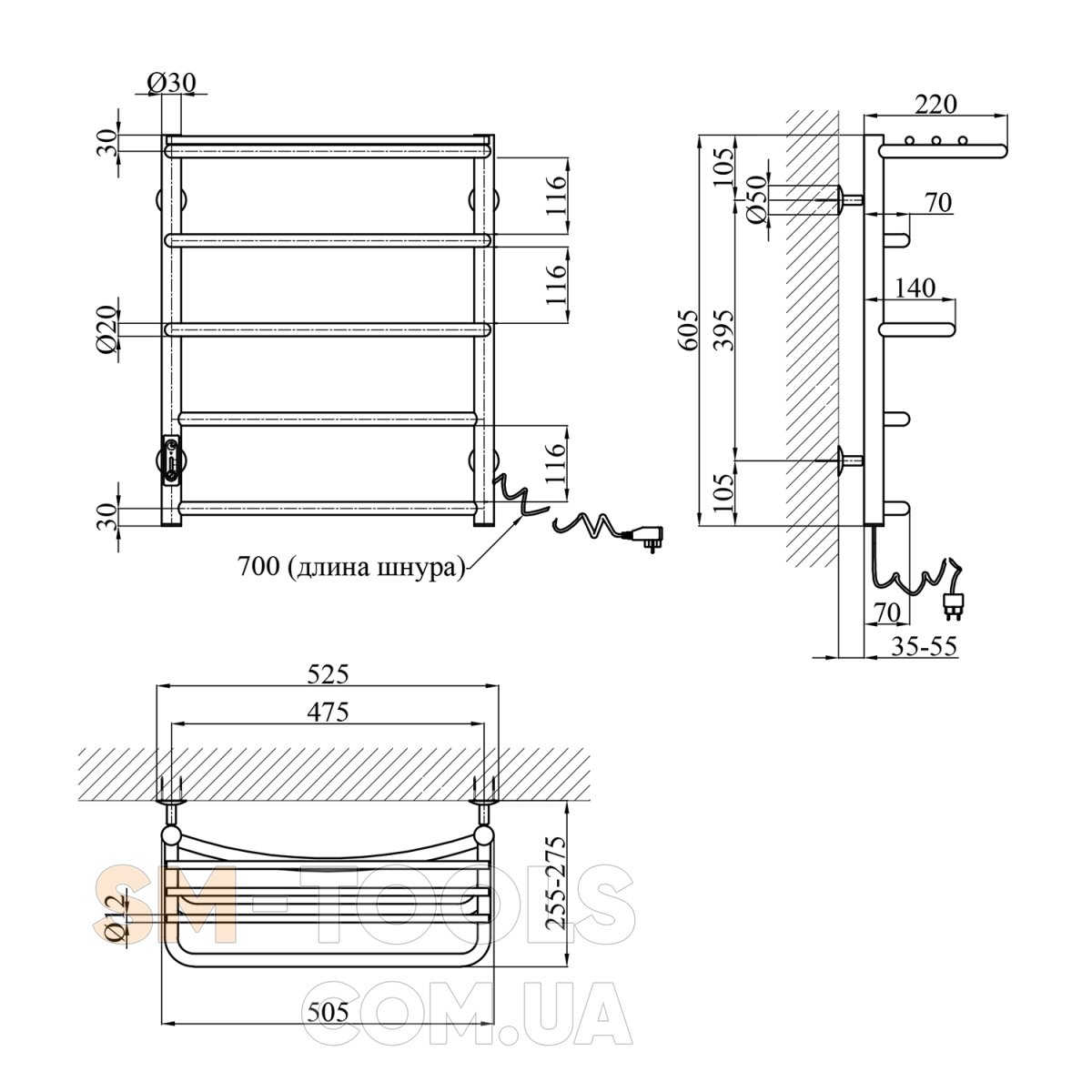 Сушарка має 5 секцій і форму «драбинка», а також обладнана верхньою полицею з трьома перекладинами, яка створює додаткове місце для речей. Її розміри складають 605 мм у висоту, 525 мм у ширину та 255 мм у глибину, що робить пристрій компактним і зручним для будь-якої ванної кімнати.