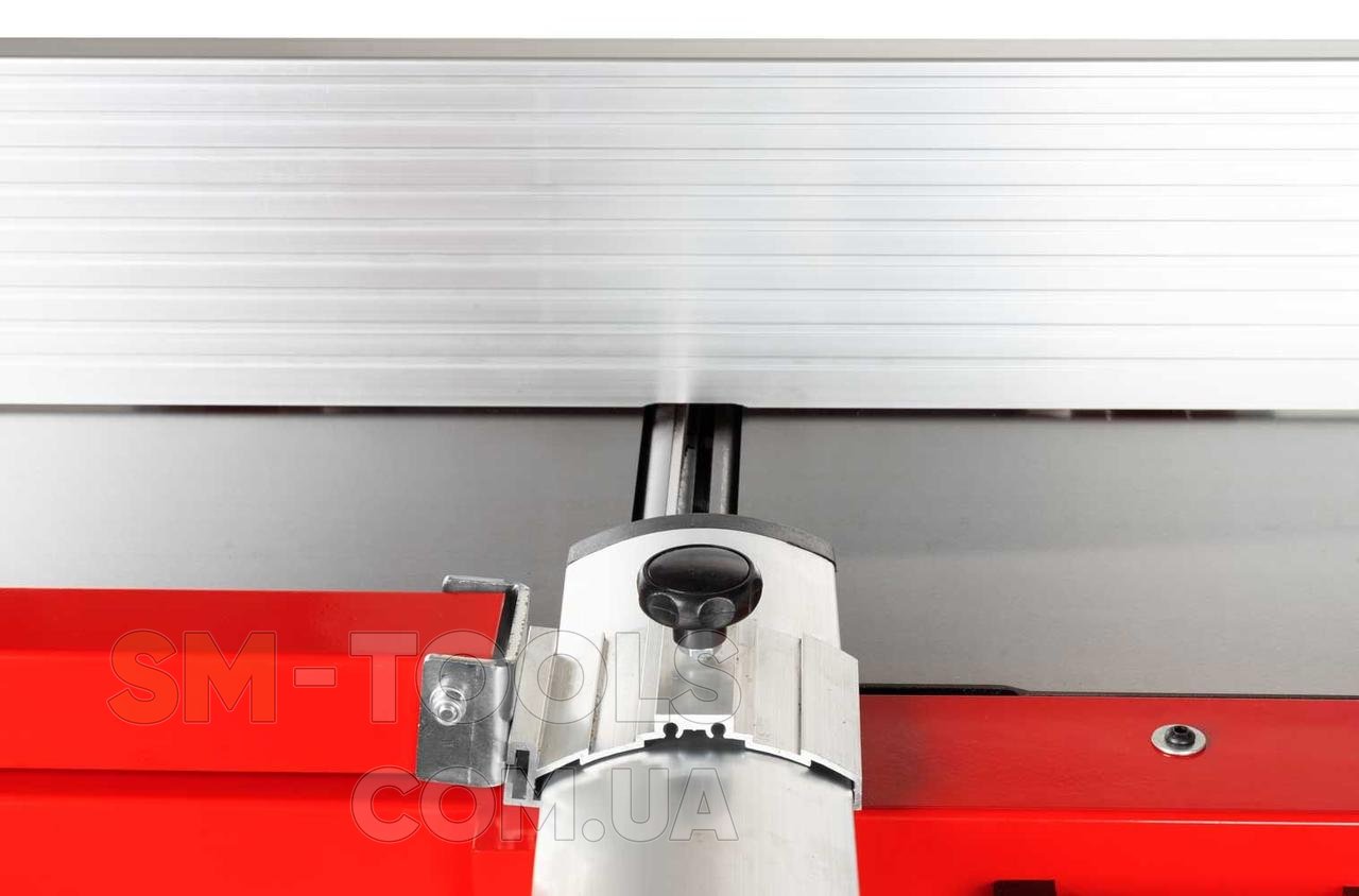 Перехід від фуганка до рейсмуса здійснюється шляхом відкидання столів. Фугувальні столи виготовлені з міцного чавуну і мають довжину 1285 мм, висота столів плавно регулюється по міліметровій шкалі. Глибина стругання за один прохід становить 4 мм. Фугувальний упор має нахил під кутом від -45° до 90°. Масивна станина забезпечує стабільність обробки і відсутність вібрацій. Є вихід для підключення аспірації. Якщо ви в роздумах, який купити фугувально-стругальний верстат, зверніть увагу на цю модель.
