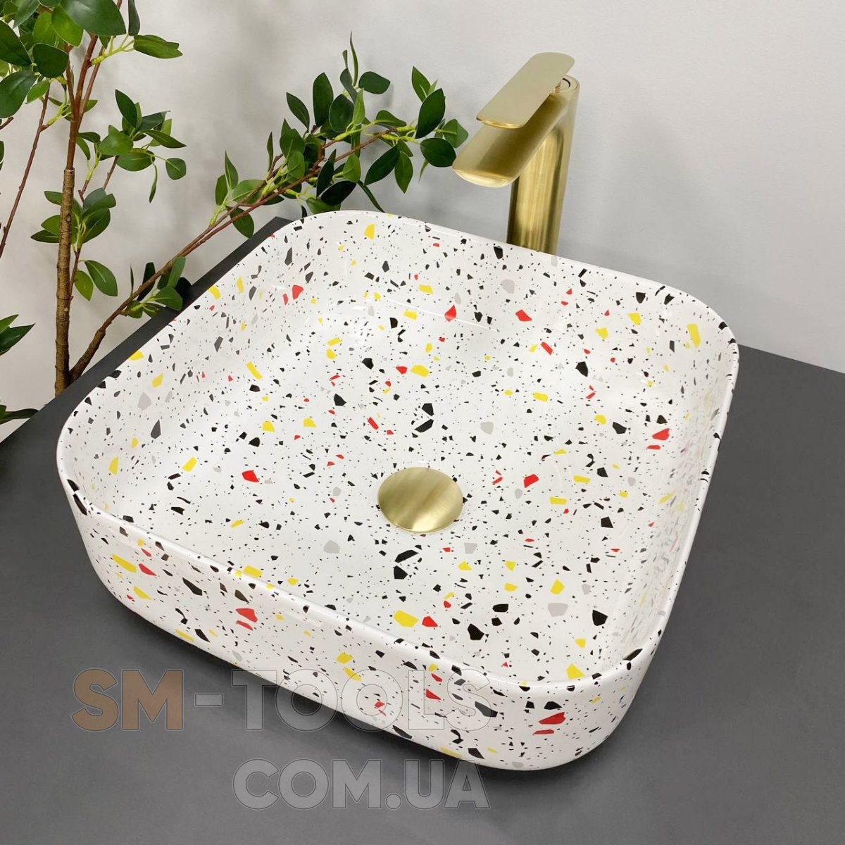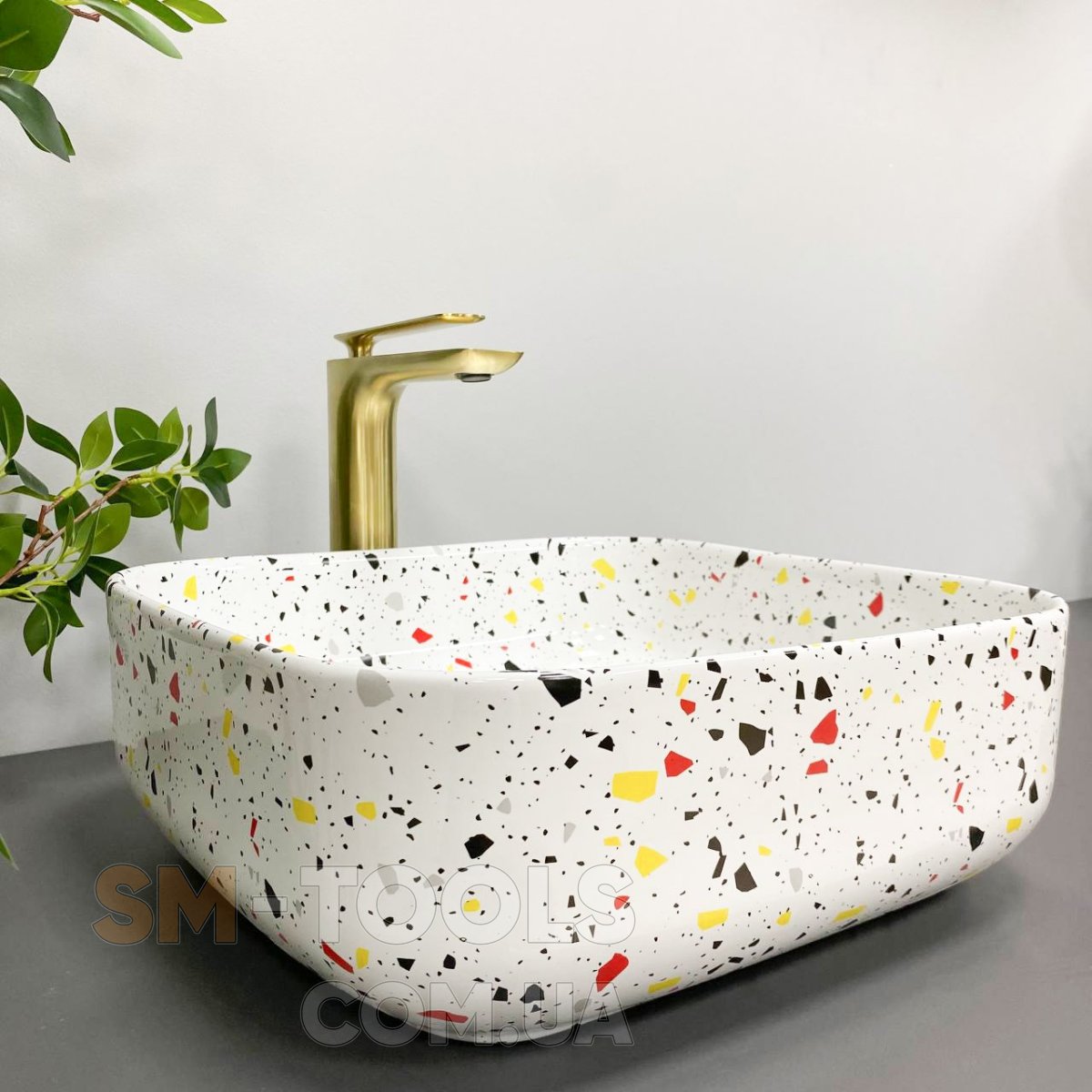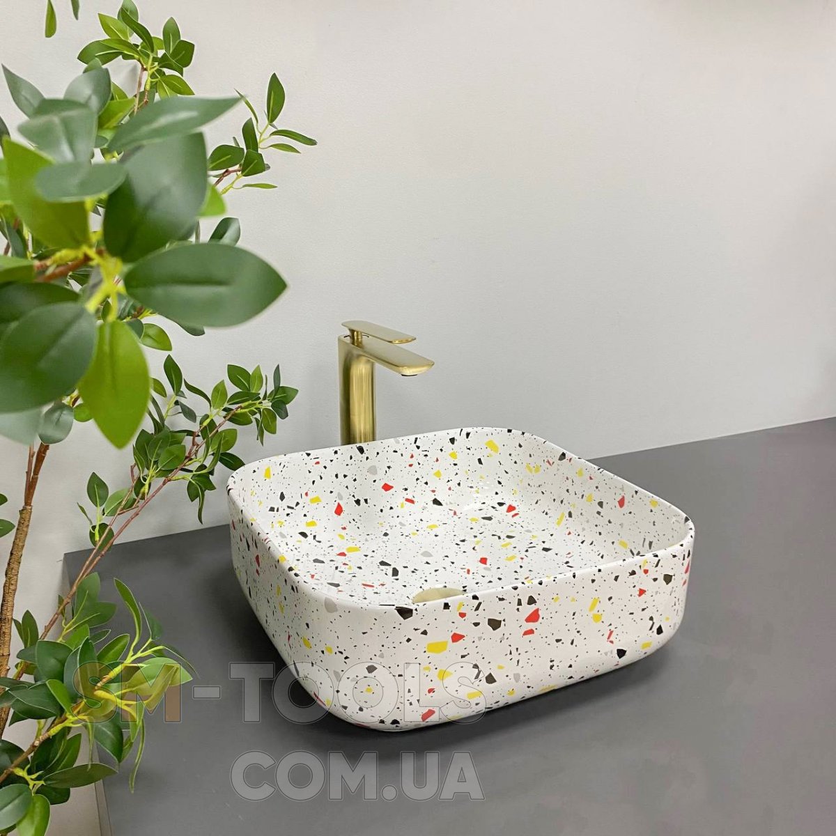 Накладні раковини серії VBI ALGHERO користуються високим попитом і доступні в різних кольорах у матовому та глянсовому виконанні. Раковина має неймовірну квадратну форму із заокругленнями. Накладна за способом встановлення раковина виготовлена із високоякісної кераміки. Модель VBI ALGHERO TE?ZO має унікальний візерунок. В основі є білий колір, прикрашений хаотичними, кольоровими цятками це надає раковині яскравого характеру.