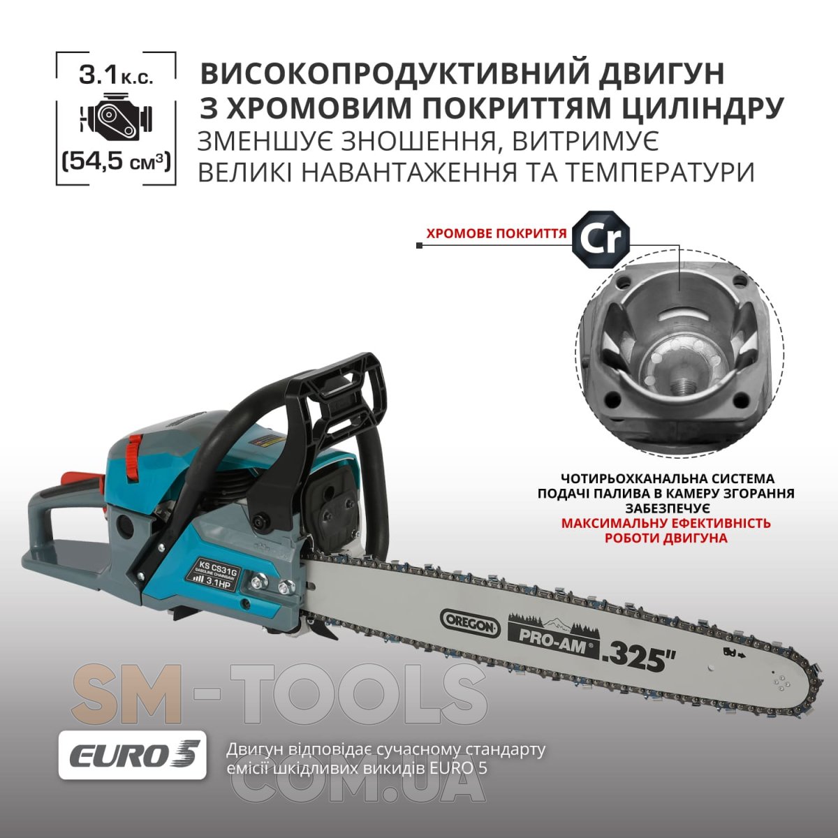 - ГНУЧКІСТЬ У ВИБОРІ КОМПЛЕКТУЮЧИХ: Залежно від діаметру та породи деревини, які потрібно пиляти, є можливість обрати довжину шини та ланцюга для ефективної роботи. На вибір пропонуються шини та ланцюги від виробників: K?nner & S?hnen® та Орегон.