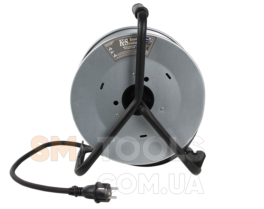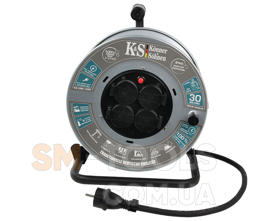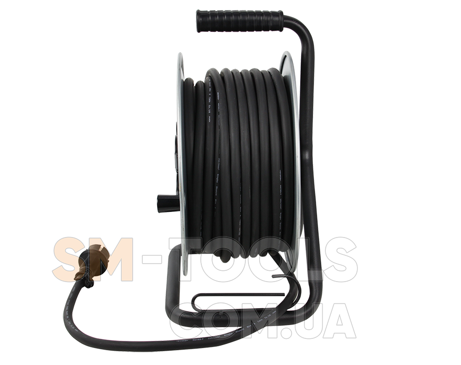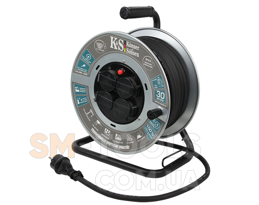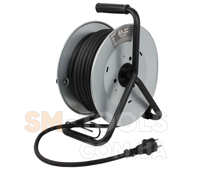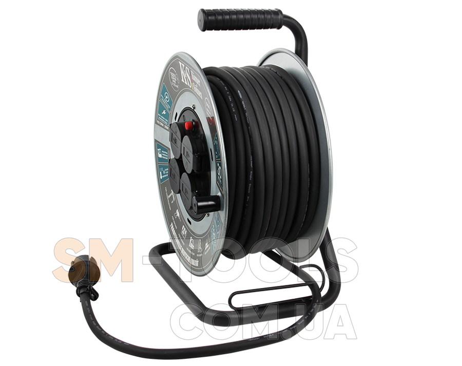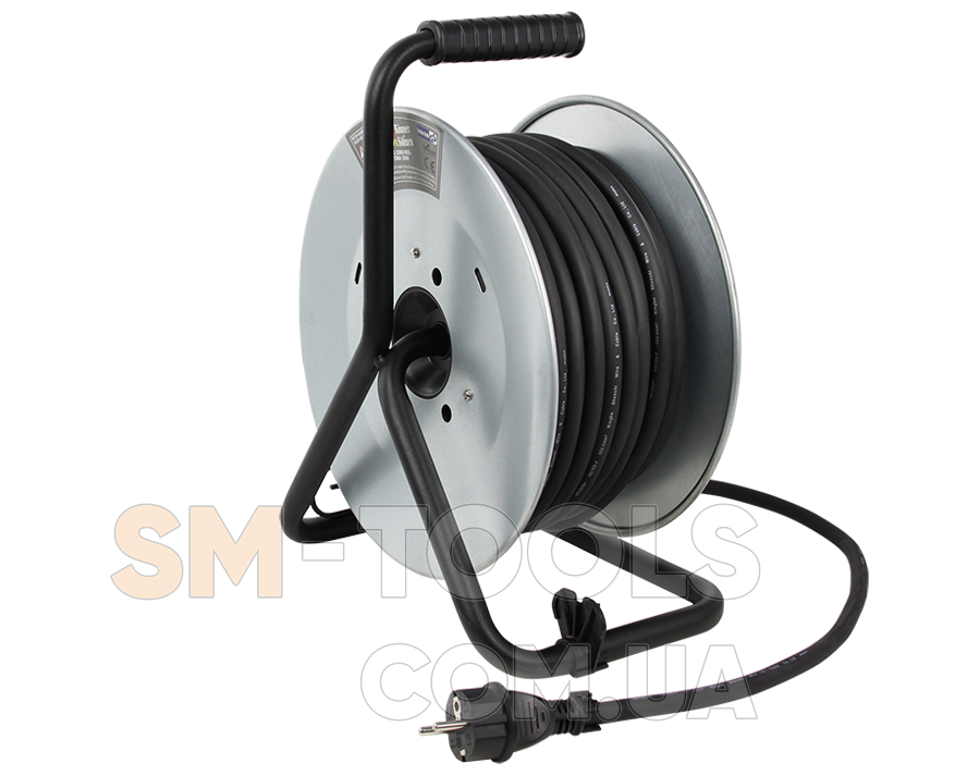 Котушка виготовлена зі спеціального посиленого металу, має міцну металеву рамну конструкцію, стійку до пошкоджень. Оснащена ергономічною гумовою ручкою для комфортного переміщення, фіксатором кабелю, кріпленням для регулювання направлення кабелю, фіксатором для блокування довільного розкручування котушки. Довжина кабелю сягає 30 метрів та підходить для віддаленого підключення до 4-х електричних приладів одночасно. -