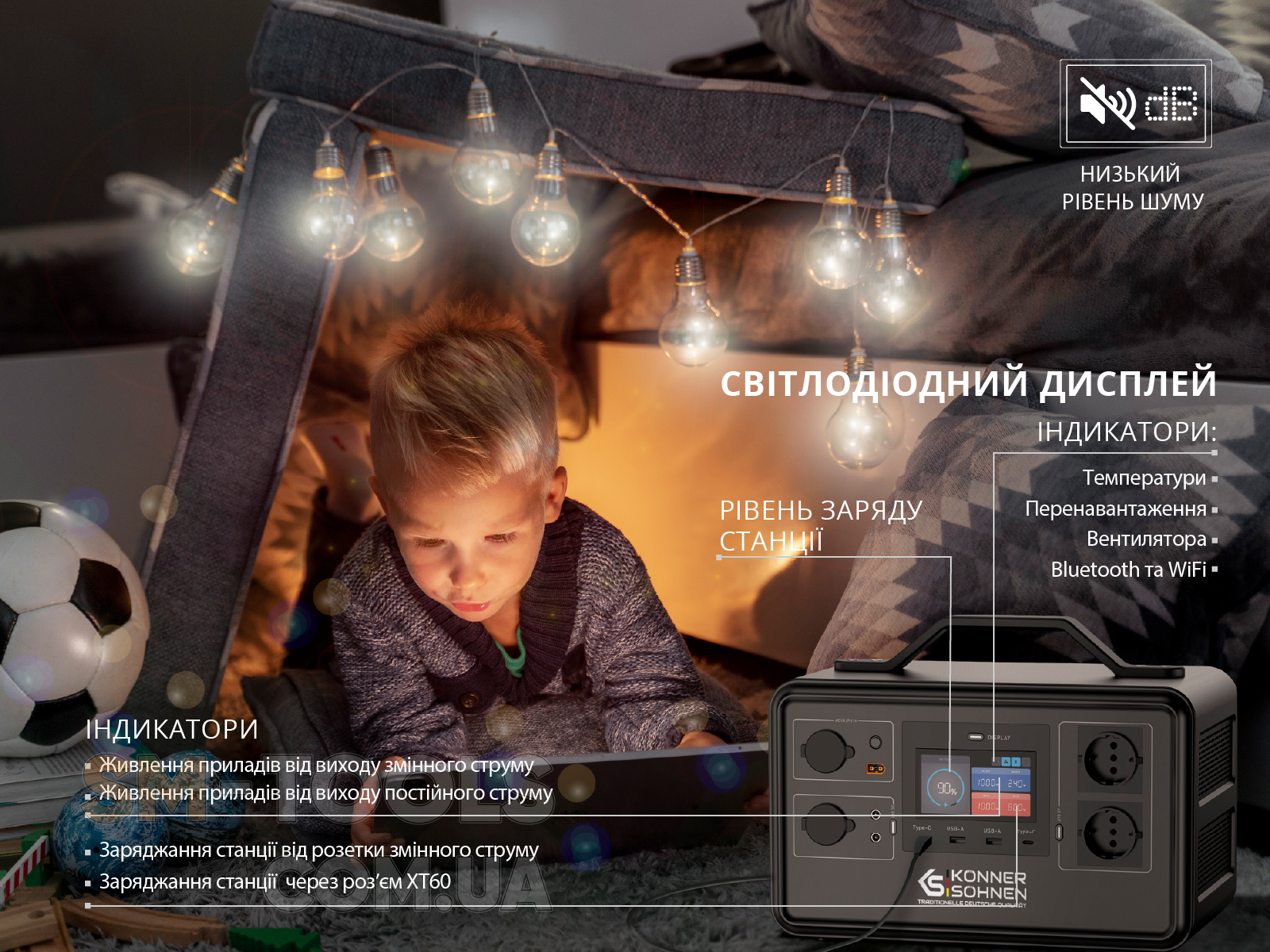 Цифровий кольоровий дисплей відображає показники робочого стану, серед яких індикатор заряду у відсотках, індикатор температури, вентилятора, Bluetooth та WiFi та інші. Ви можете вимкнути дисплей вручну, натиснувши кнопку, якщо він не потрібен. -