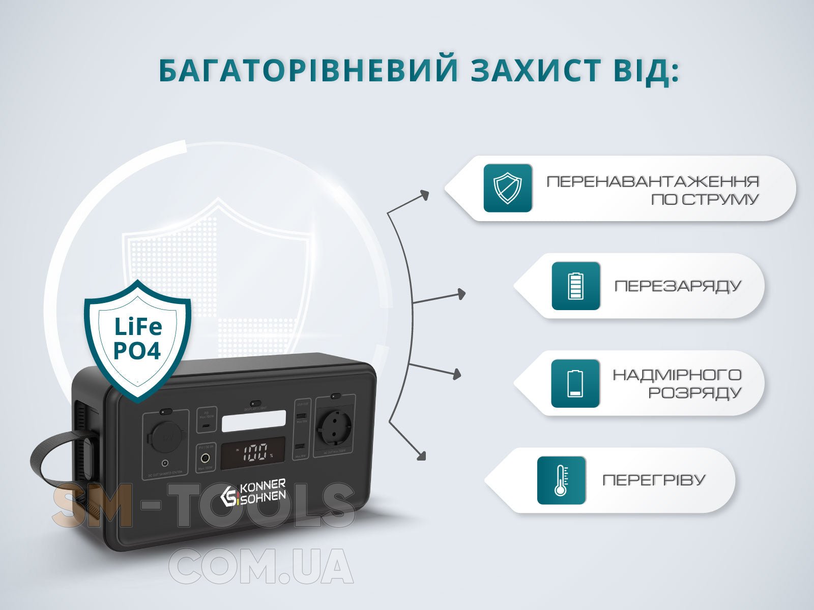 Багаторівневий захист від: перевантаження струмом, перезарядження, надмірного розряду, перегріву. -
