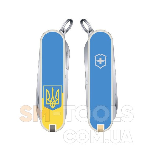 Эксклюзивный и высококачественный швейцарский нож Victorinox Classic SD Ukraine Vx0.6223.7R3 с украинской символикой покорил многие сердца во всем мире. Герб (Тризуб) – символ Независимой Украины. Именно он и расположен на рукояти Victorinox Classic SD Ukraine Vx0.6223.7R3. Модель выполнена из нержавеющей стали со специальными высокопрочными пластиковыми накладками на рукоятке. Поэтому, Victorinox Classic SD Ukraine Vx0.6223.7R3, долговечный и надёжный для использования. Отдельно стоит отметить и функциональность складного набора. Поскольку, отлично режущее лезвие выручит Вас во многих работах. К примеру, с его помощью Вы легко вскроете конверт и даже сможете сделать чистки и нарезки фруктов. А вот ножницы с пилочкой и пинцетом – ежедневные помощники. Плюс, швейцарский нож содержит и специальную отвёртку, которая легко закрутит и открутит крепёжные изделия. Безусловно, что подвесное кольцо замечательно послужит в качестве брелка. Victorinox Classic SD Ukraine Vx0.6223.7R3 – отличный презентабельный подарок как для сильной так и для прекрасной половины человечества.