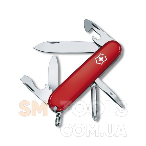 Ищите удобный и компактный складной нож для ежедневных целей! Тогда, Вам замечательно подойдёт Victorinox Tinker Vx14603. Модель имеет лёгкий вес и удобный размер. Поэтому, сможете её носить с собой всегда. Плюс, выполнена с глянцевой, ярко-красной презентабельной рукояткой на которой красуется фирменный логотип компании Victorinox (Викторинокс). Содержит 9 элементов, исполняющих 13 функций. В арсенале складного набора большой и малый клинки, которые долгое время не требуют дополнительной заточки. Инструменты Вам помогут в быту, командировках и других местностях. В путешествиях всегда понадобятся специальные открывалки для консервов и бутылок. А во многих ремонтах выручит шило, а так же приспособление для снятия изоляции с крестовыми и плоскими отвёртками. Оригинальное кольцо послужит Вам вместо брелка. Отлично дополняют модель и пинцет с зубочисткой. Складной нож Victorinox Tinker Vx14603 изготовлен из нержавеющей стали с высокопрочными накладками из пластика.