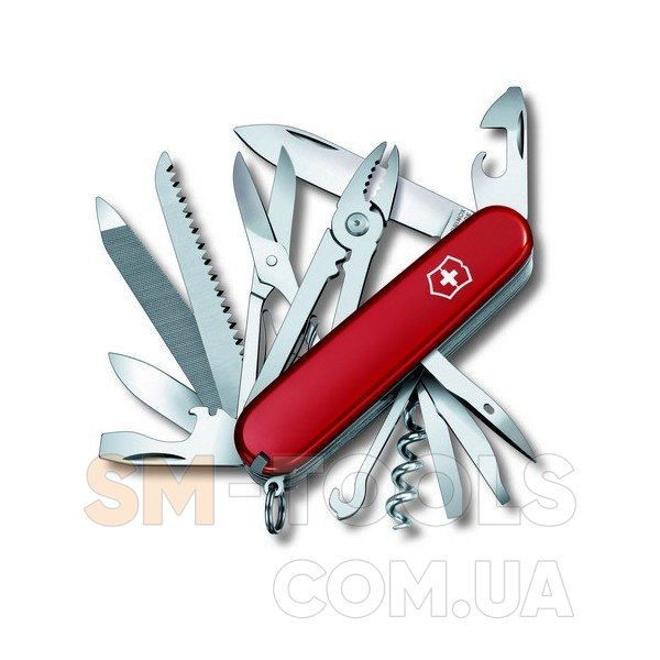 Высококачественный, уникальный, многофункциональный – швейцарский нож Victorinox Handyman Vx13773. Изготовлен из нержавеющей стали с высокопрочными пластиковыми накладками. Отдельно стоит отметить и функциональность Victorinox Handyman Vx13773. Оснащён большим и малым режущими лезвиями, которые долгое время не требуют дополнительной заточки. Клинки безусловно помогут Вам выполнить множество работ. К примеру, с ними сделаете чистки фруктов или же нарезки продуктов. Специальная пила по дереву срежет ветки, и распилит дерево небольшого размера. А за счёт стамески выполните токарные работы. В арсенале складного набора и режущая пила по металлу с напильником. Инструмент сделает как срез так и обработку металла. В ремонтах выручат приспособление для снятия изоляции и отвёртки, которые легко закручивают и откручивают крепёжные изделия. А так же высокопрочные плоскогубцы, которые к примеру, сделают обжим проводов. В поднятии разных тяжестей понадобиться и многоцелевой крючок. Тогда, как острое шило сделает отличный прокол.