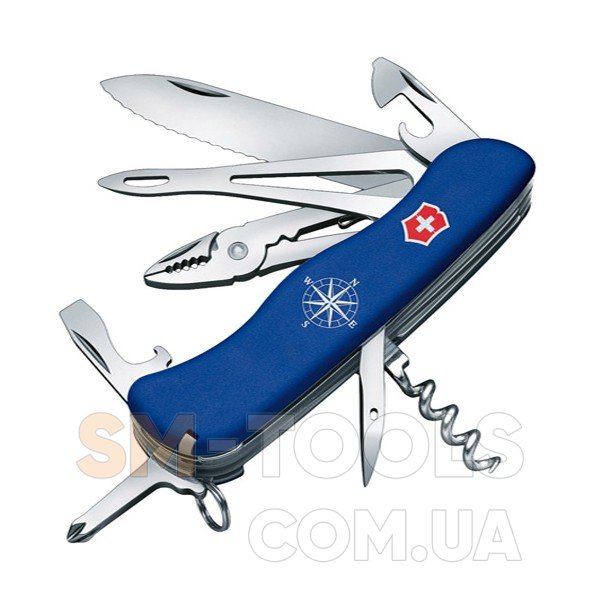 В каждом морском походе Вам поможет свайка с боцманской иглой и ключ для чекелей. А главное серрейторный клинок, который легко перерезает канаты, тросы и другие плотные ткани. Оснащён швейцарский нож и ригельным фиксатором, за счёт которого лезвие самопроизвольно не складывается. Поэтому, убережёт Вас от ранений. Дополнительно модель имеет и стандартные элементы. Конечно, что без них моряки не обходятся. Victorinox Skipper Vx09093.2W, так же как и другие модели самого востребованного производителя ножей изготовлен из нержавеющей стали. Отдельно стоит отметить и рукоятку из высокопрочного пластика. А за счёт матового покрытия Ваша рука не будет скользить даже в дождь. Синий цвет изделия безусловно успокаивает и символизирует преданность, настойчивость и стремление к победе. Логотип бренда Victorinox (Викторинокс) вместе с компасом отлично дополняет эксклюзивный дизайн Victorinox Skipper Vx09093.2W.