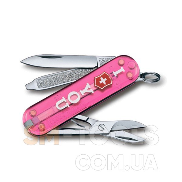 Сочетание слов «I you» вместе с логотипом по центру покорили сердца многих во всем мире. Ведь, эта надпись имеет прямой смысл и уникальный подтекст. В первую очередь, швейцарский нож станет приятным и незабываемым подарком для прекрасной половины человечества. Ведь, изготовлен в красивом розовом цвете, с лёгким весом и компактным размером. Поэтому, Victorinox Classic Vx06223.T855 легко поместиться в карман. А за счёт своей многофункциональности станет отличным ежедневным помощником. Безусловно, что пинцет, замечательна пилочка для ухода за ногтями, а так же подвесное кольцо, которое послужит вместо брелка – всегда порадуют женщин. А вот режущий малый клинок длинной – 58 мм., станет повседневным помощником в небольших работах. К тому же, данная модель так же как и другие товары Victorinox, изготовлена исключительно из высококачественных материалов, что делает её надёжной и долговечной.