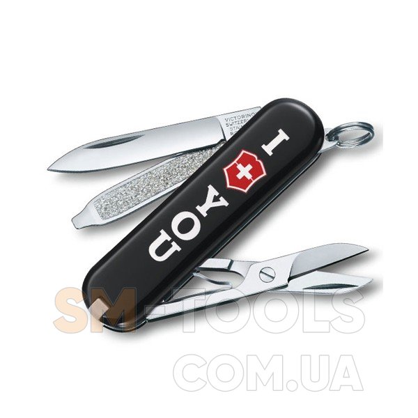 Эксклюзивное сочетание слов «I you» вместе с логотипом по центру покорили сердца многих во всем мире. Ведь, эта надпись имеет прямой смысл и уникальный подтекст. Швейцарский нож станет приятным и незабываемым подарком как для мужчин так и для женщин. Ведь, изготовлен в классическом чёрном цвете, с лёгким весом и компактным размером. Поэтому, Victorinox Classic Vx06223.853 легко поместиться в карман. А за счёт своей многофункциональности станет отличным ежедневным помощником. Безусловно, что пинцет, замечательна пилочка для ухода за ногтями, а так же подвесное кольцо, которое послужит вместо брелка – более порадуют женщин. А вот мужчины по достоинству оценят ножницы с отвёртками и режущий малый клинок – 58 мм., который всегда поможет в небольших работах. Безусловно, что отличным дополнением данной модель является презентабельная глянцевая рукоятка, которая радует каждый взор.