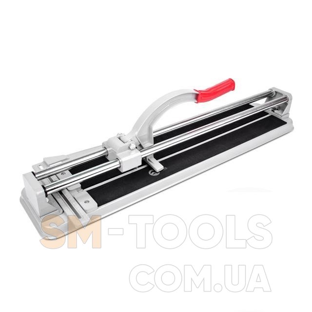 Плиткорез HT-0366 стального цвета с красной рукояткой. Длина плиткореза в 600 мм ограничивает использование плитки размером больше. Плиткорезы имеют две направляющие, по которым передвигается рукоятка. Рукоятка передвигается за счет использования игольчатого подшипника. Рукоятка выполнена в виде серпа, удобна для создания оптимального давления на плитку. Конструкция рукоятки позволяет легко передавать необходимое давление на плитку, что бы предотвратить ее раскол. Наличие и использование разлинеенной шкалы позволяет выполнять порезку плитки с точностью до миллиметров.