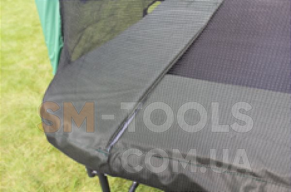 Покрытие состоит из мягкого вспененного материала внутри, а сверху зашито плотным ПВХ зеленого цвета. Внизу покрытие крепиться к каркасу батута специальными веревками. Советуем, обязательно привязывать все стороны покрытия к каркасу, используя при этом, все присутствующие для этого веревки.