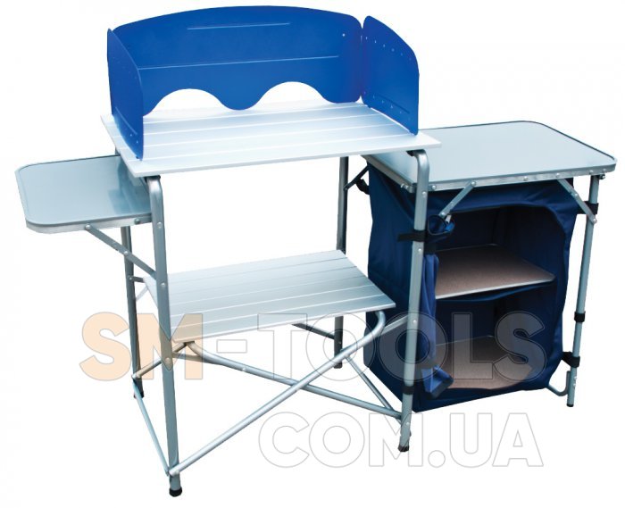 Похідна кухня має знімний складний вітрозахисний екран, зручну шафку з полицями для зберігання посуду та продуктів. Ніжки можуть регулюватися по висоті, що надає додаткової стійкості. Кухня складається в кейс, зручний для транспортування та має додатковий тканинний чохол, який захищає від подряпин при перевезенні та зберіганні.